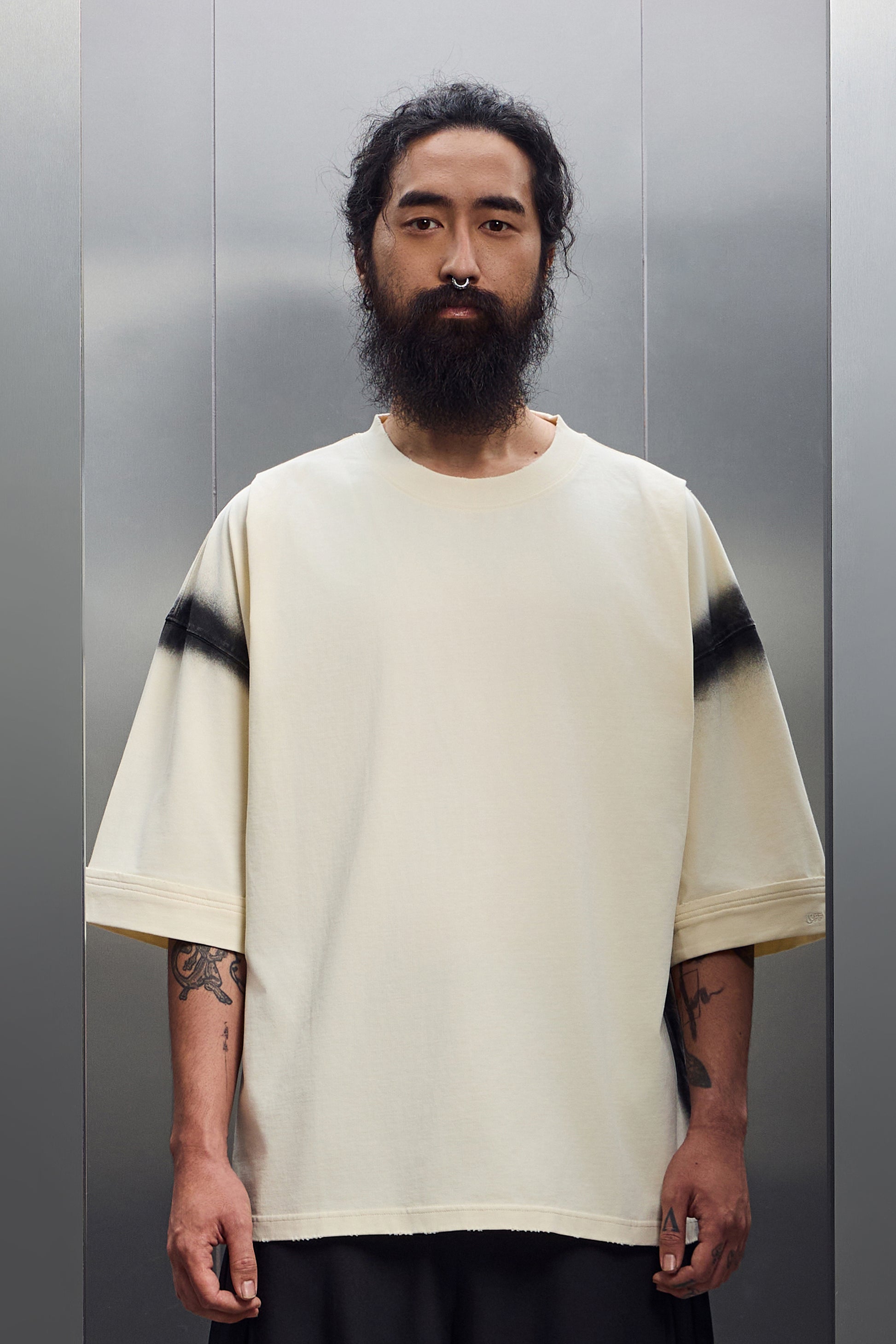 The folded shoulder line and distressed paint feel create a slightly rebellious attitude for office workers in the elevator.