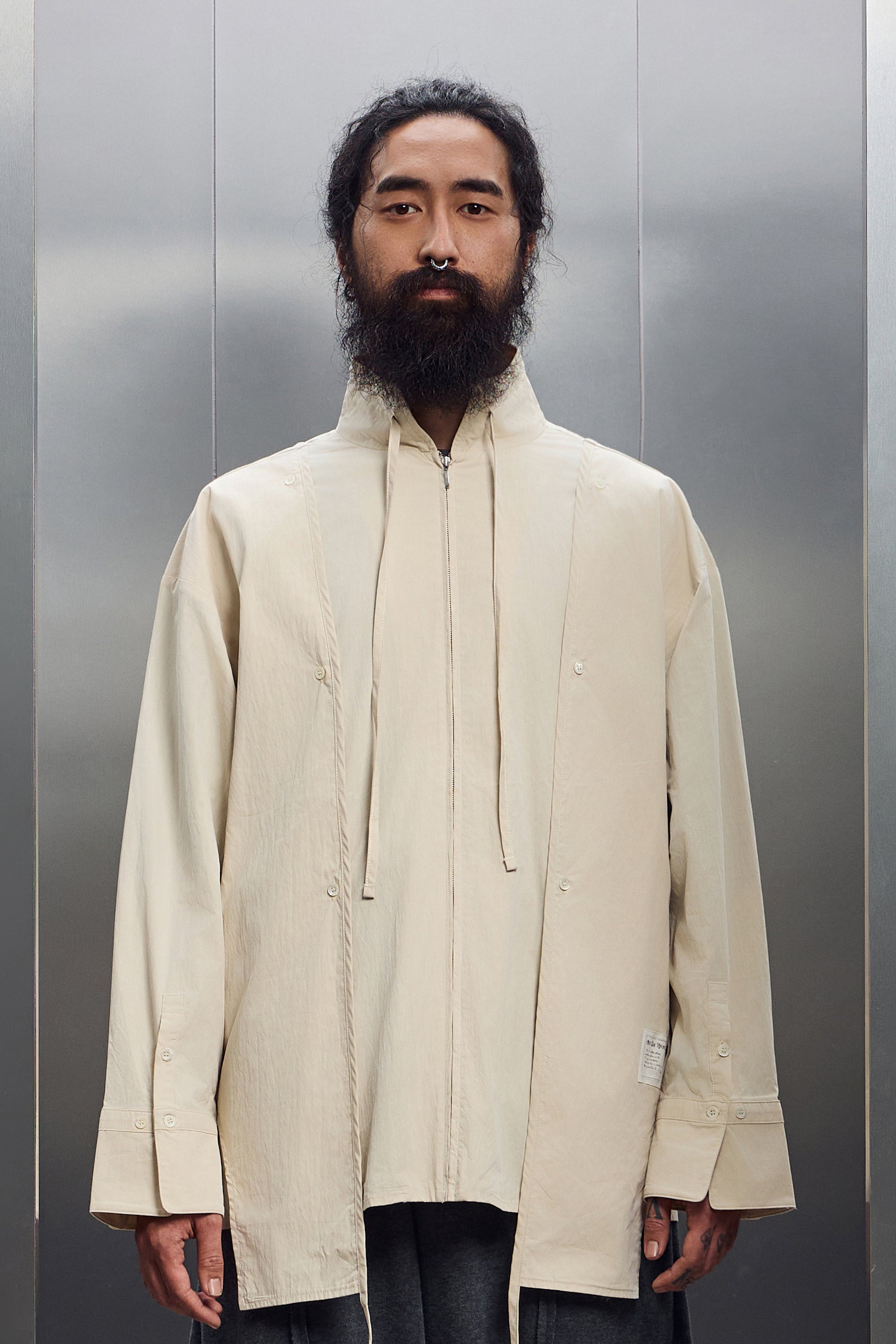 The semi-deconstructed overlapping buttons + small stand-up collar are like the casualness after loosening the tie. The cuff tape and hem label details hide a relaxed and functional feel.
