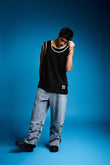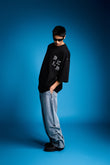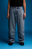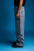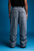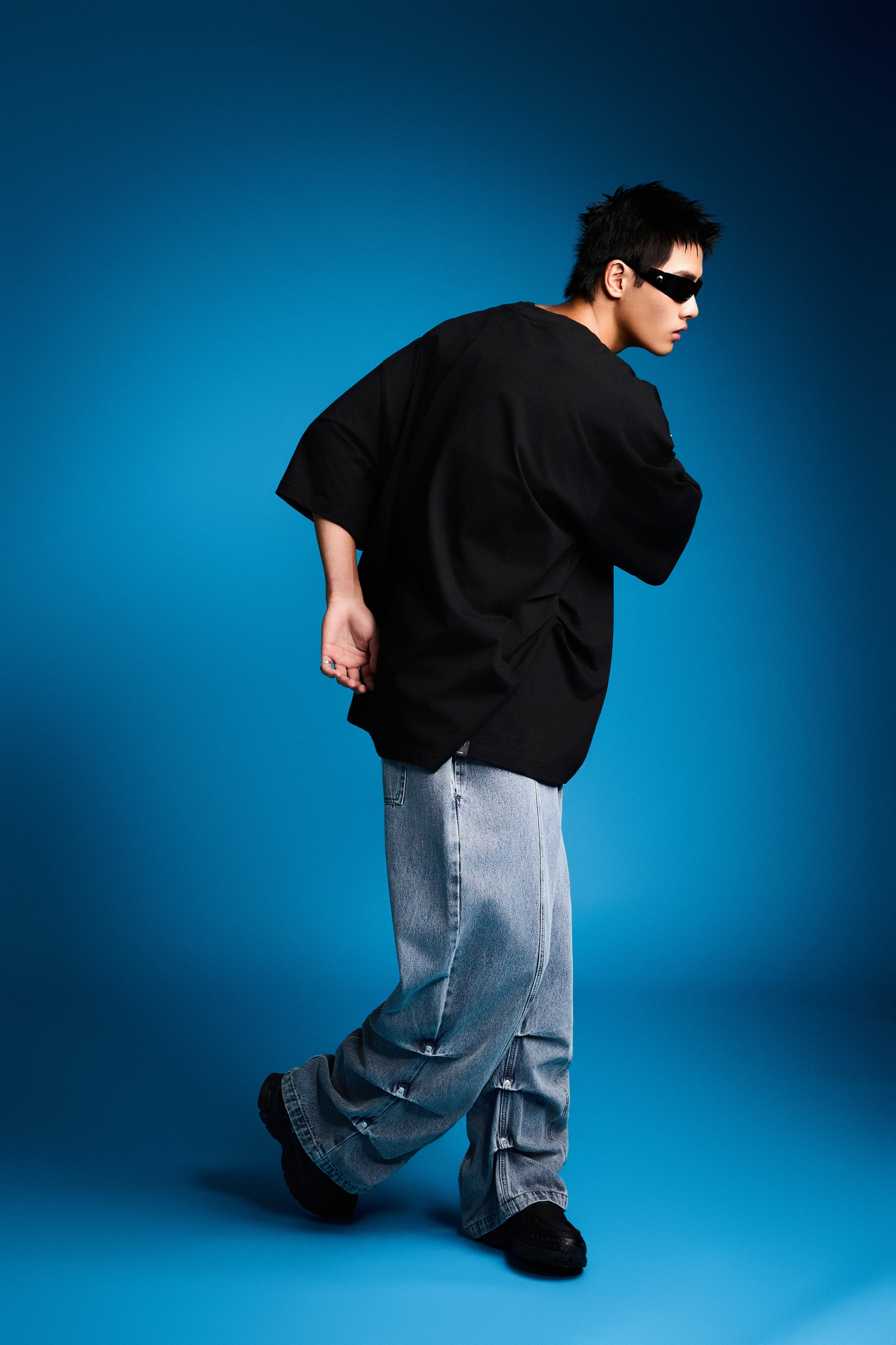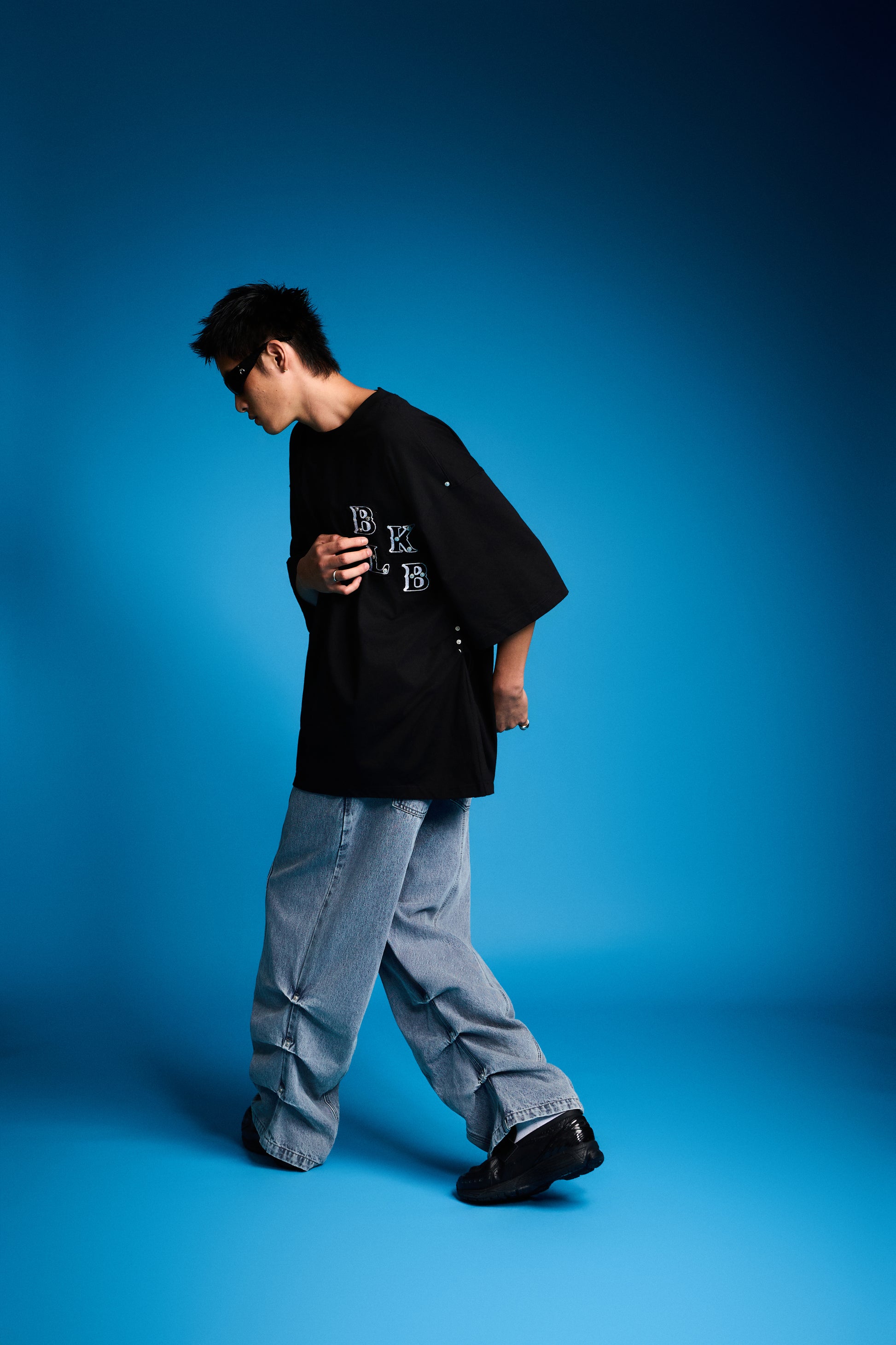 - 脇邊打上BK六角釘釦,營造出多摺堆疊的立體效果,重新演繹傳統直筒褲的廓型輪廓,注入更多實驗性與設計感。