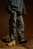 後側貼袋造型呼應弧形褲腳設計,形成上下連動的視覺節奏,強化整體平衡感