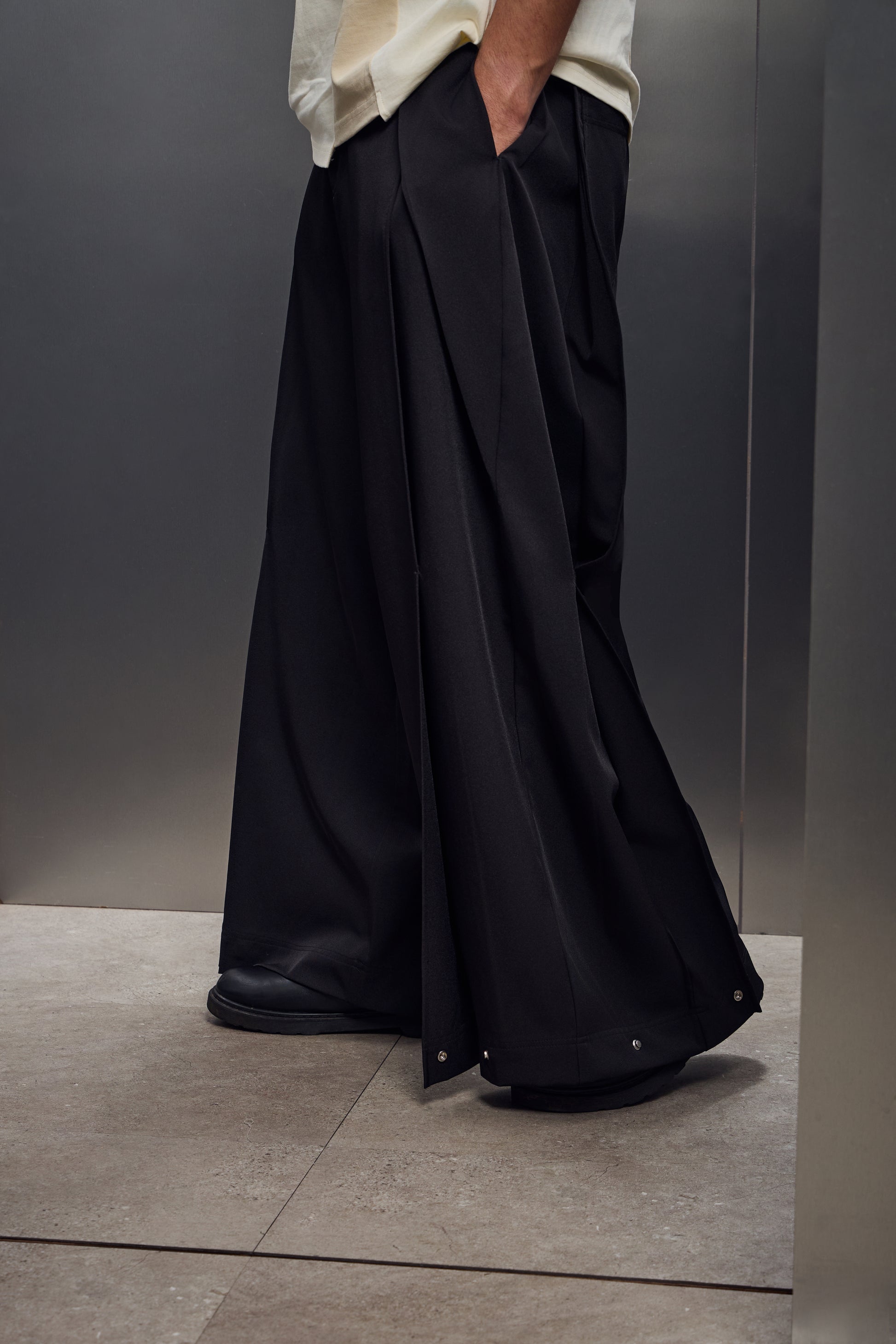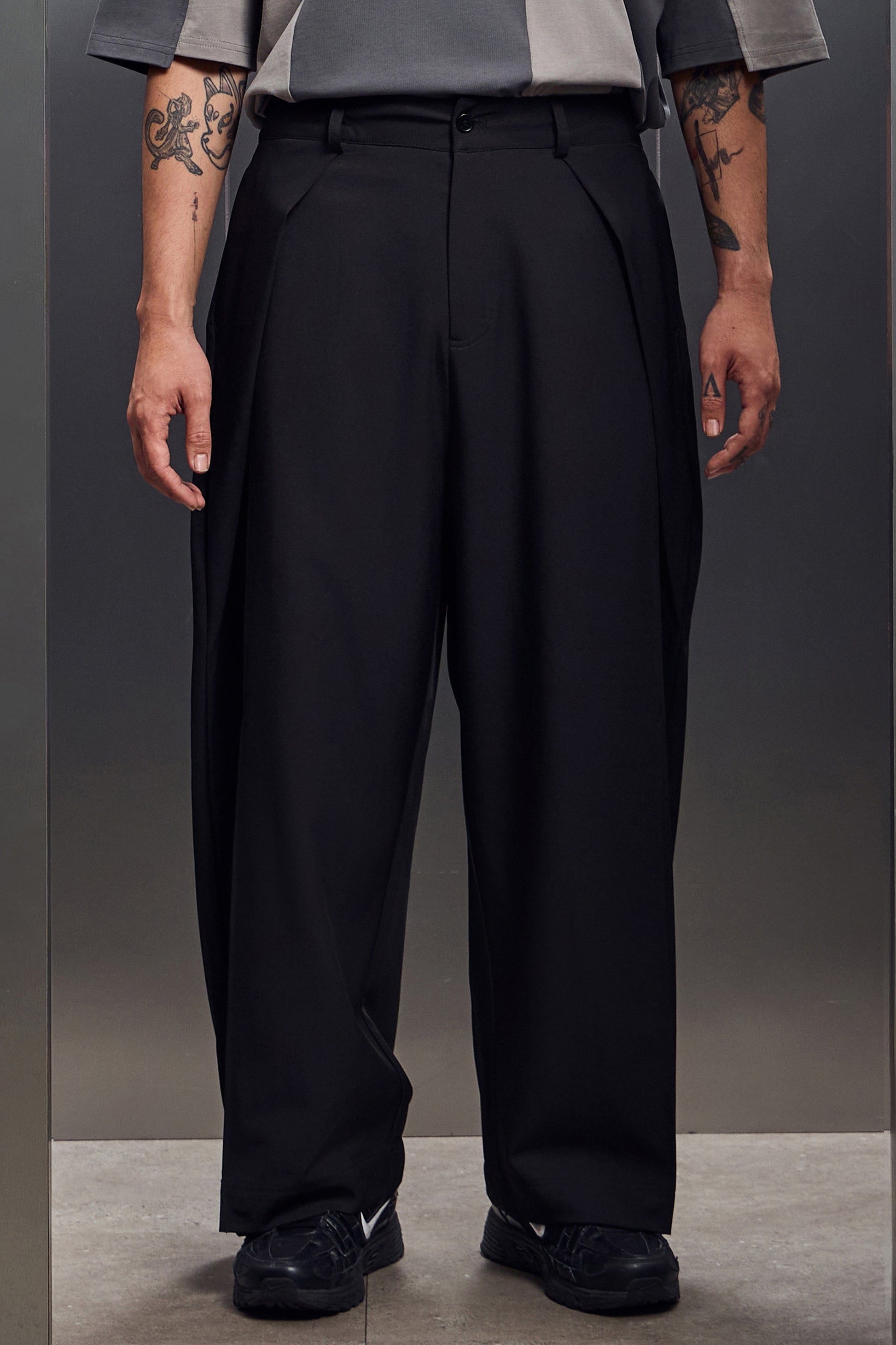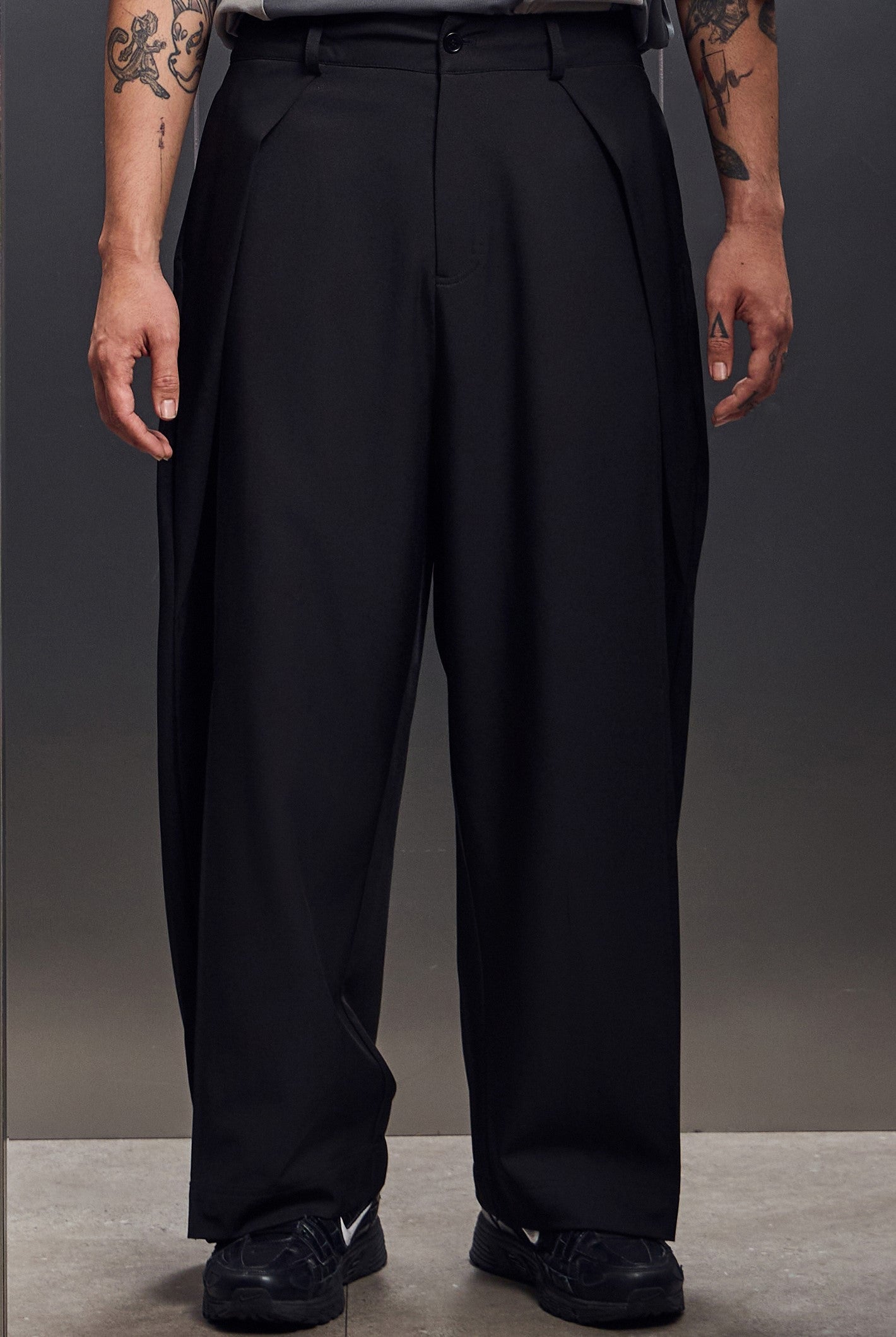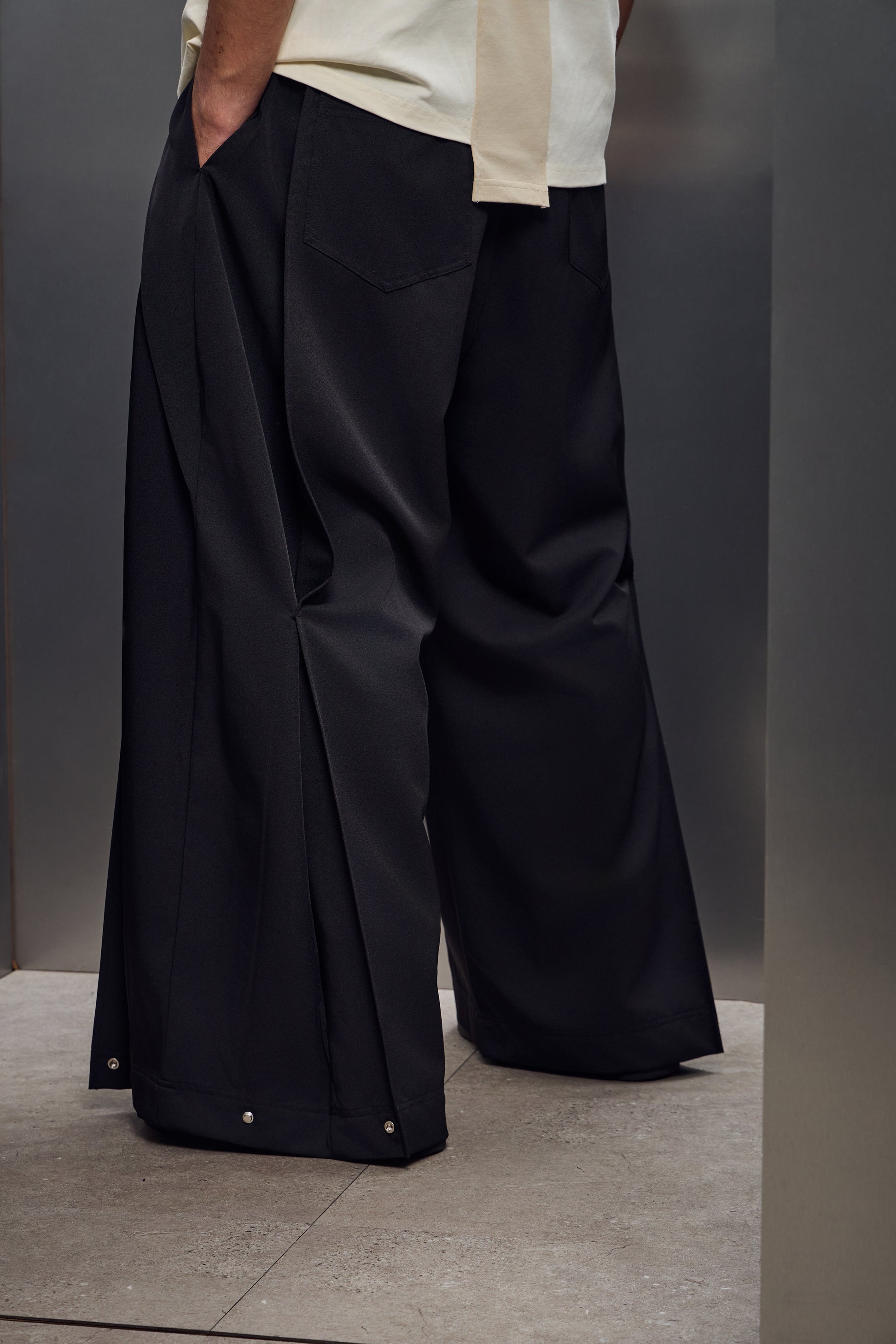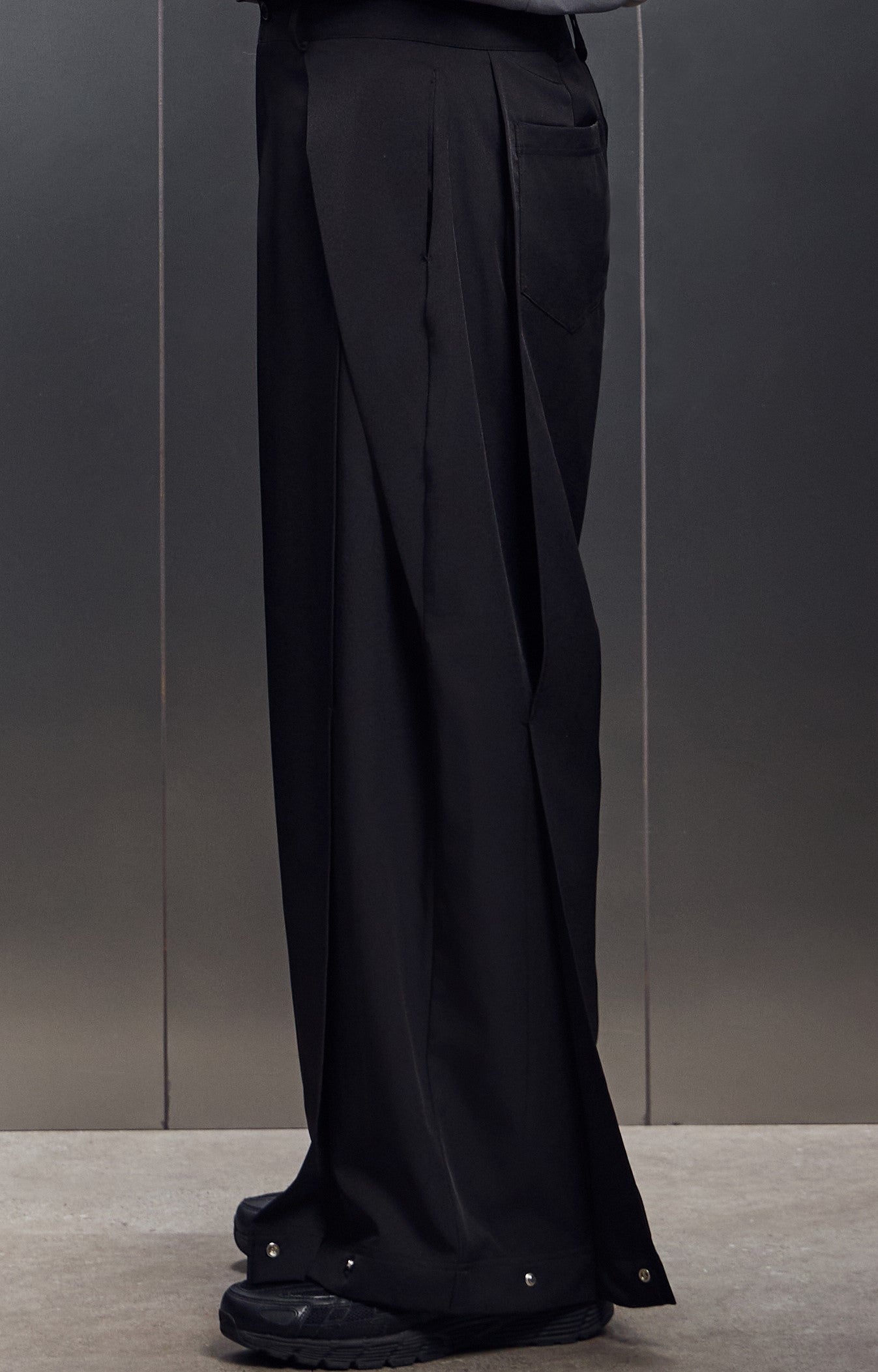 雙摺褲片+褲腳釦環,自由調整版型,將西裝輪廓轉化為街頭鬆弛態度。