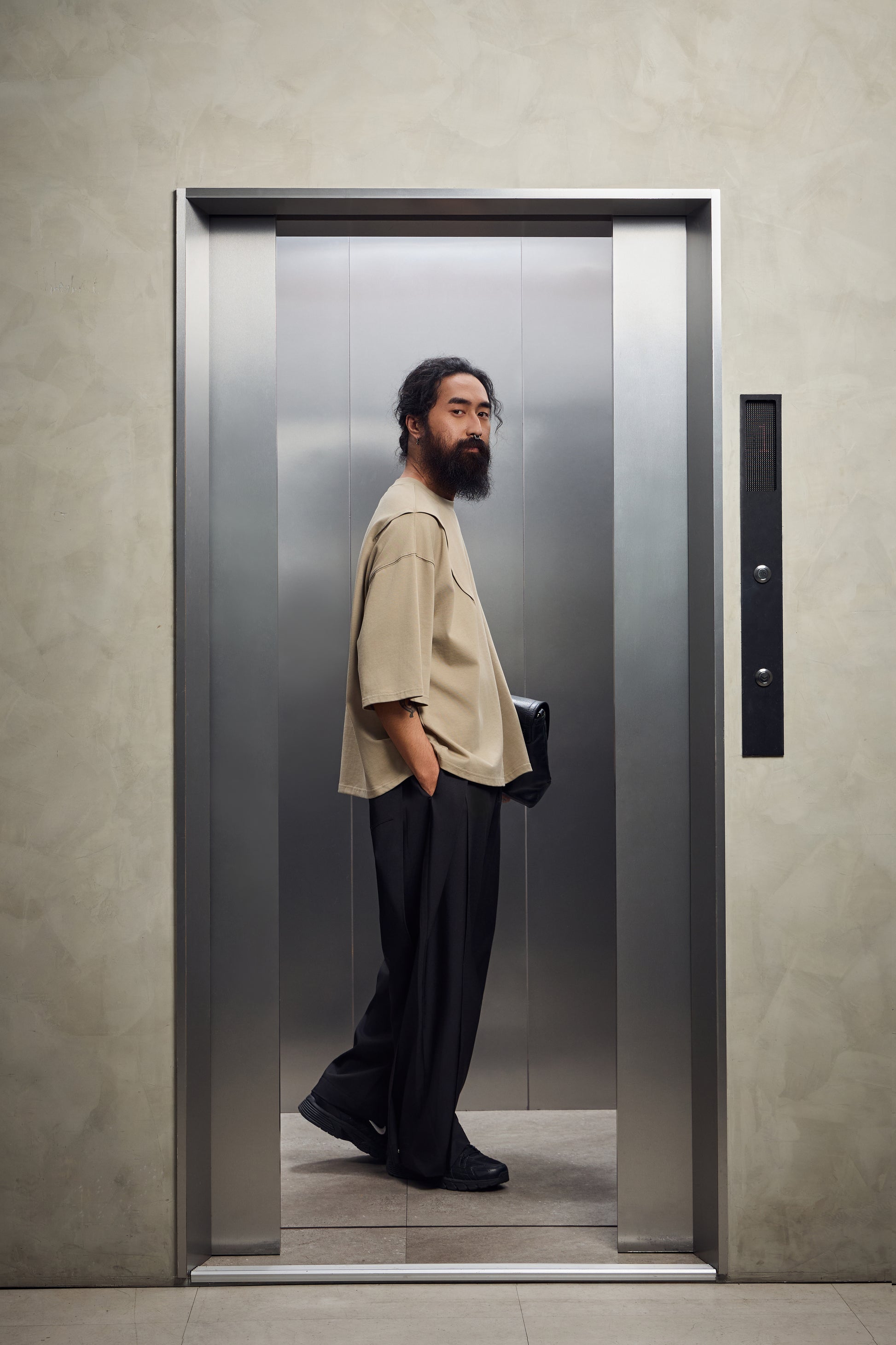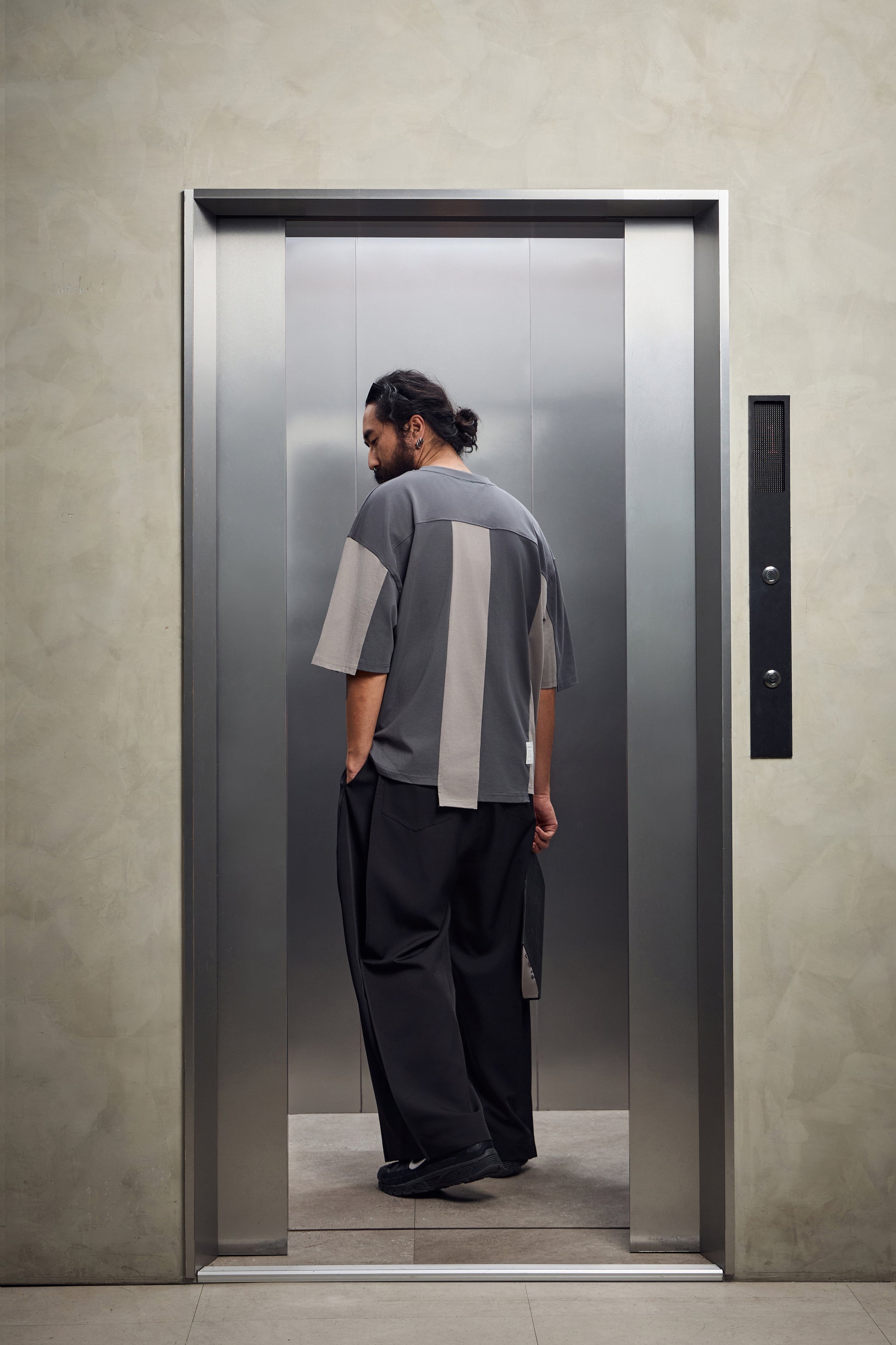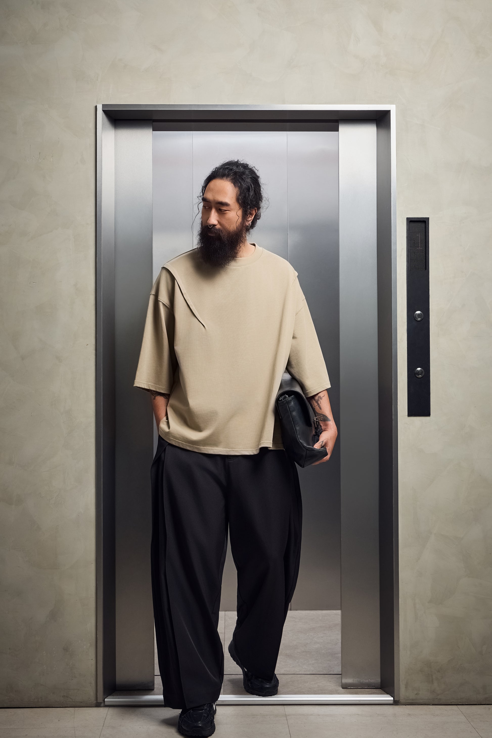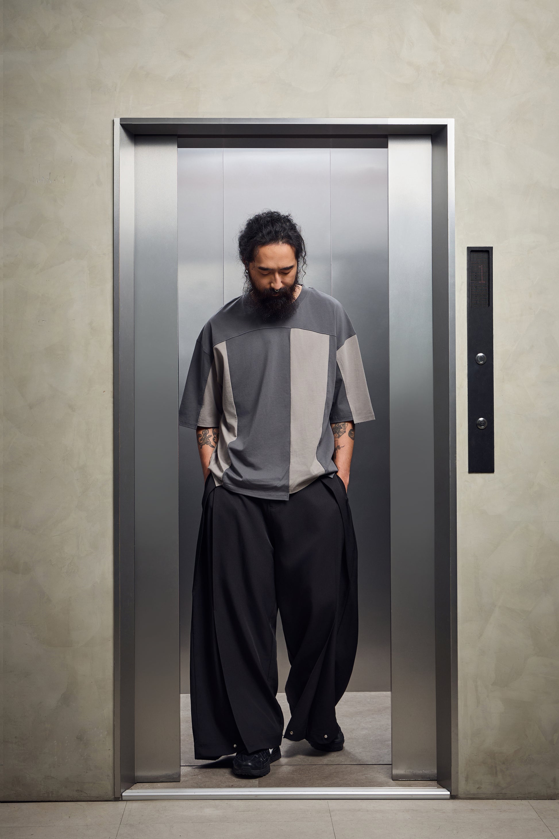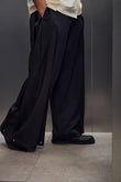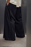 雙摺褲片+褲腳釦環,自由調整版型,將西裝輪廓轉化為街頭鬆弛態度。