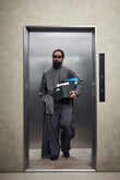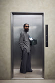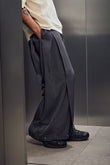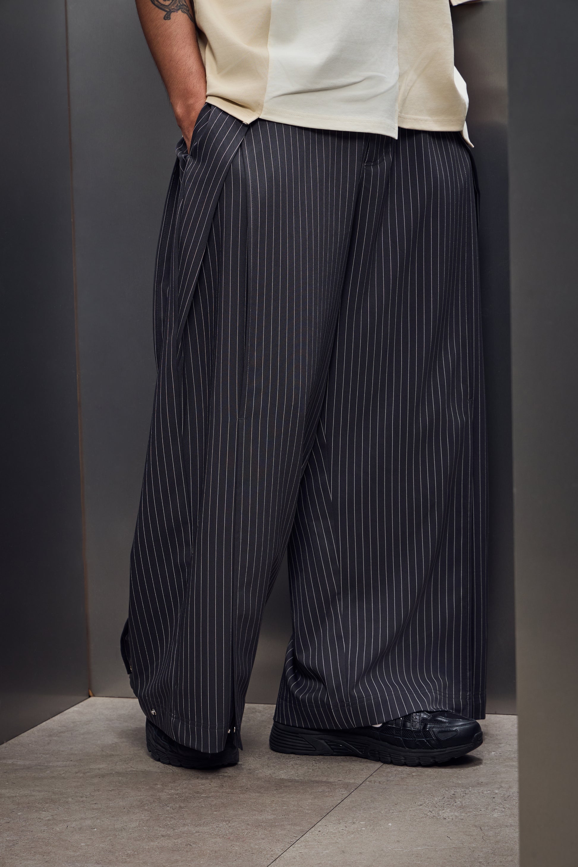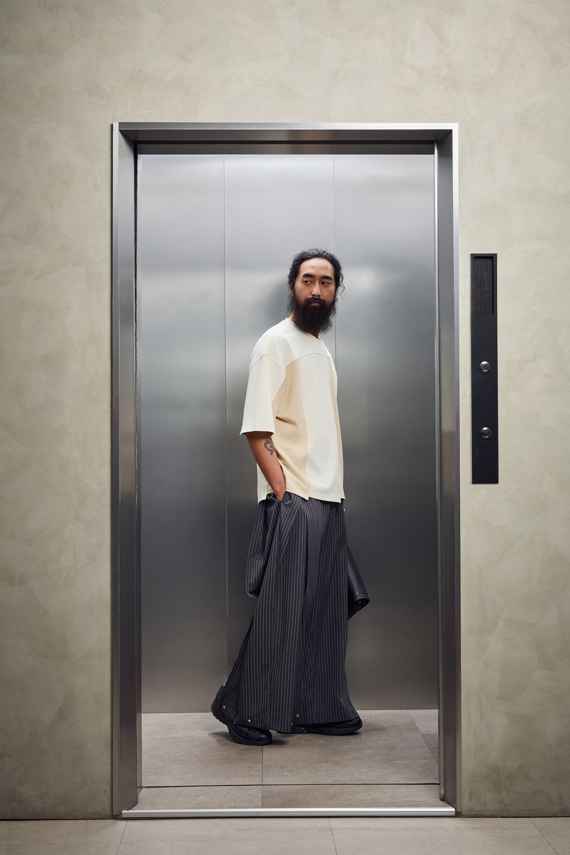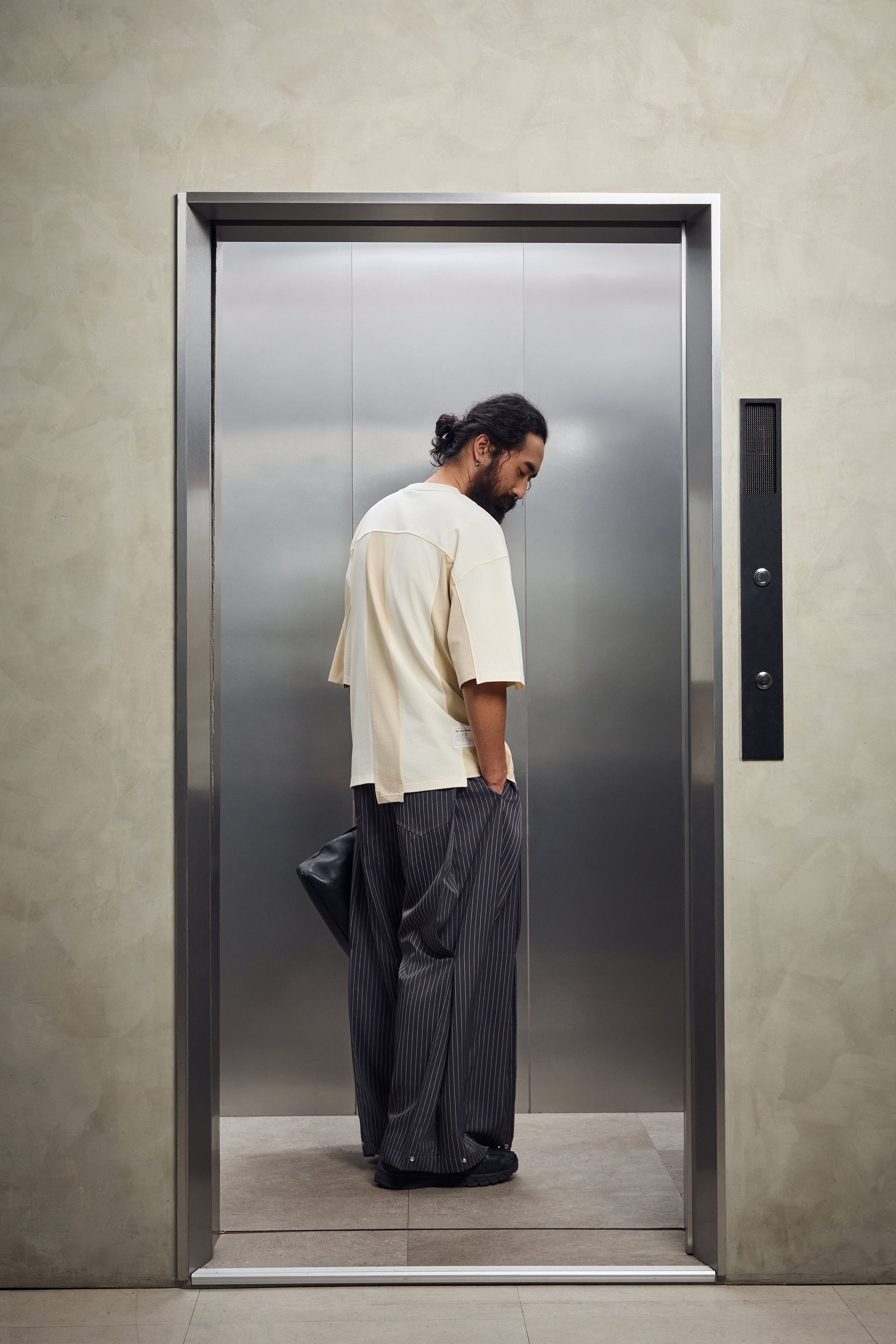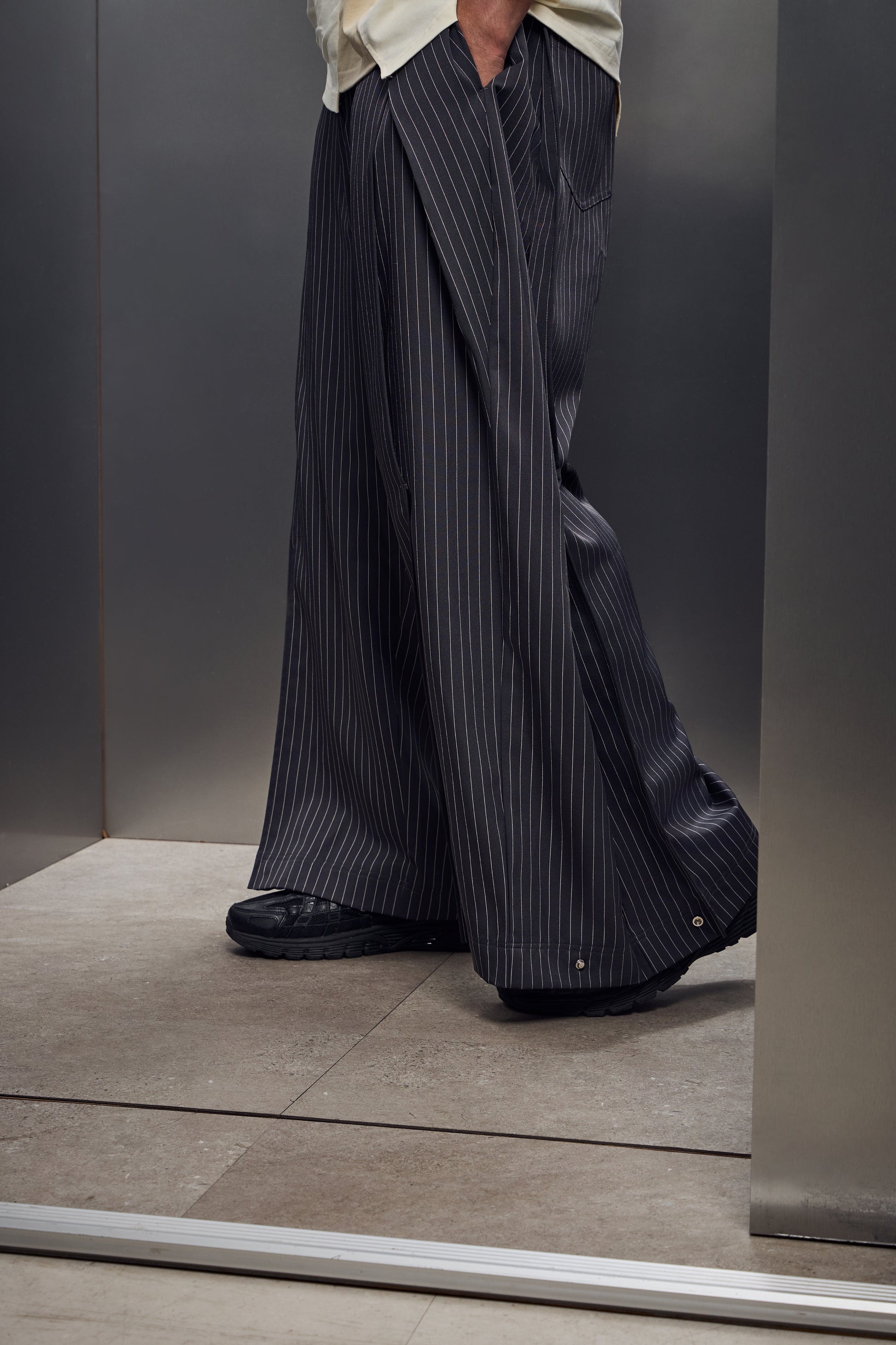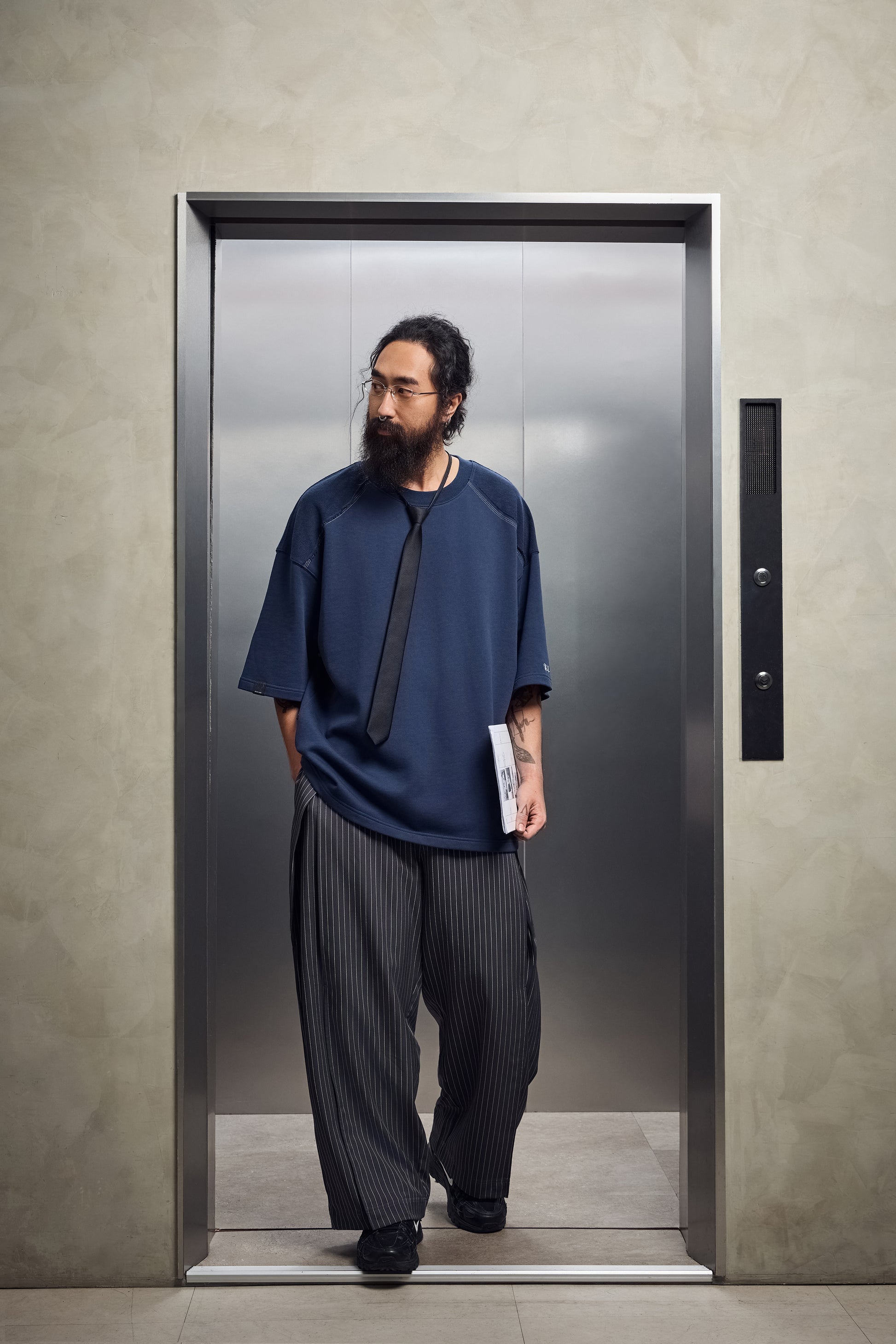 灰色直紋雙層褲片設計,跳脫正裝單調,像上班族每日切換的模式。