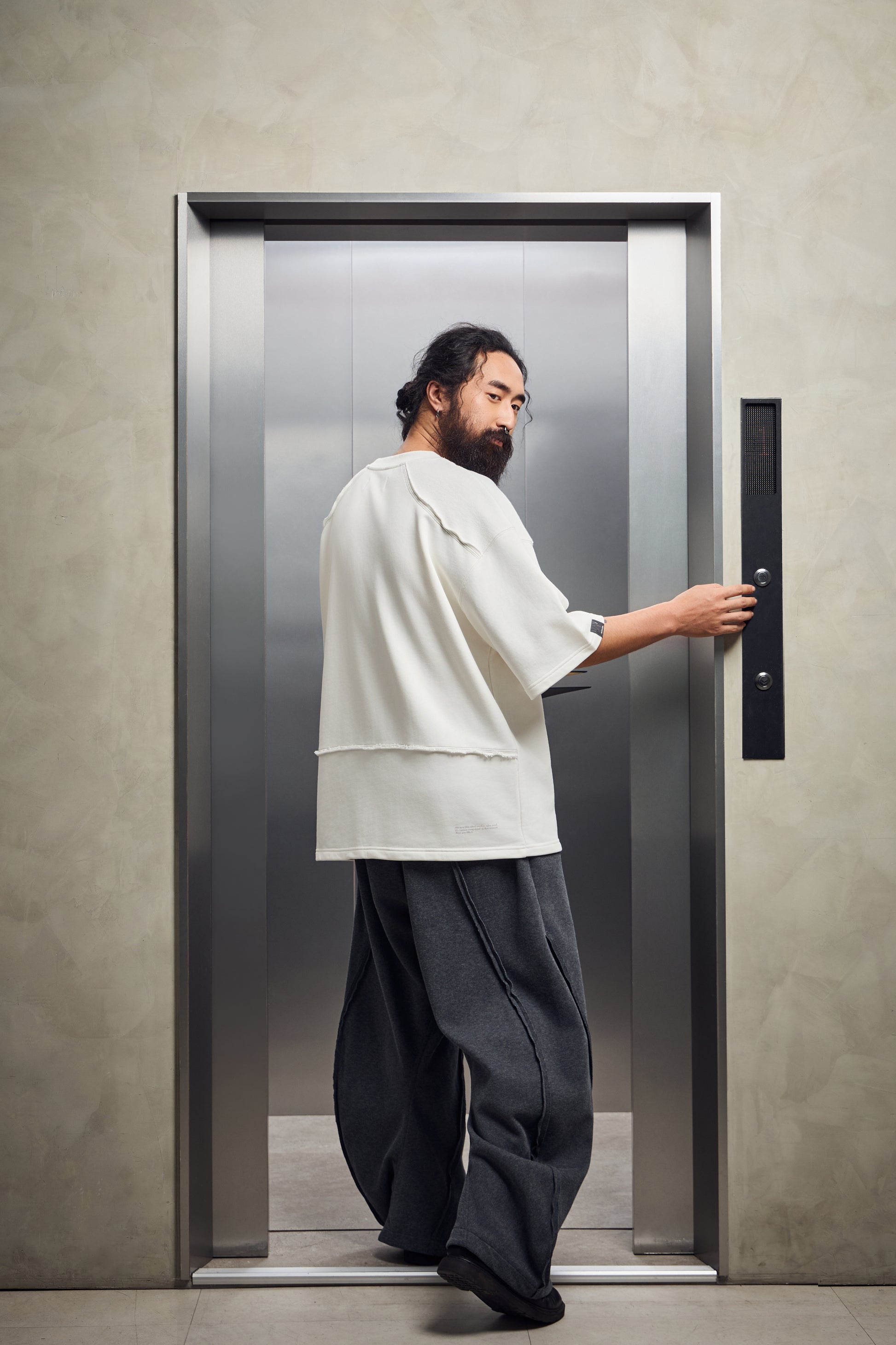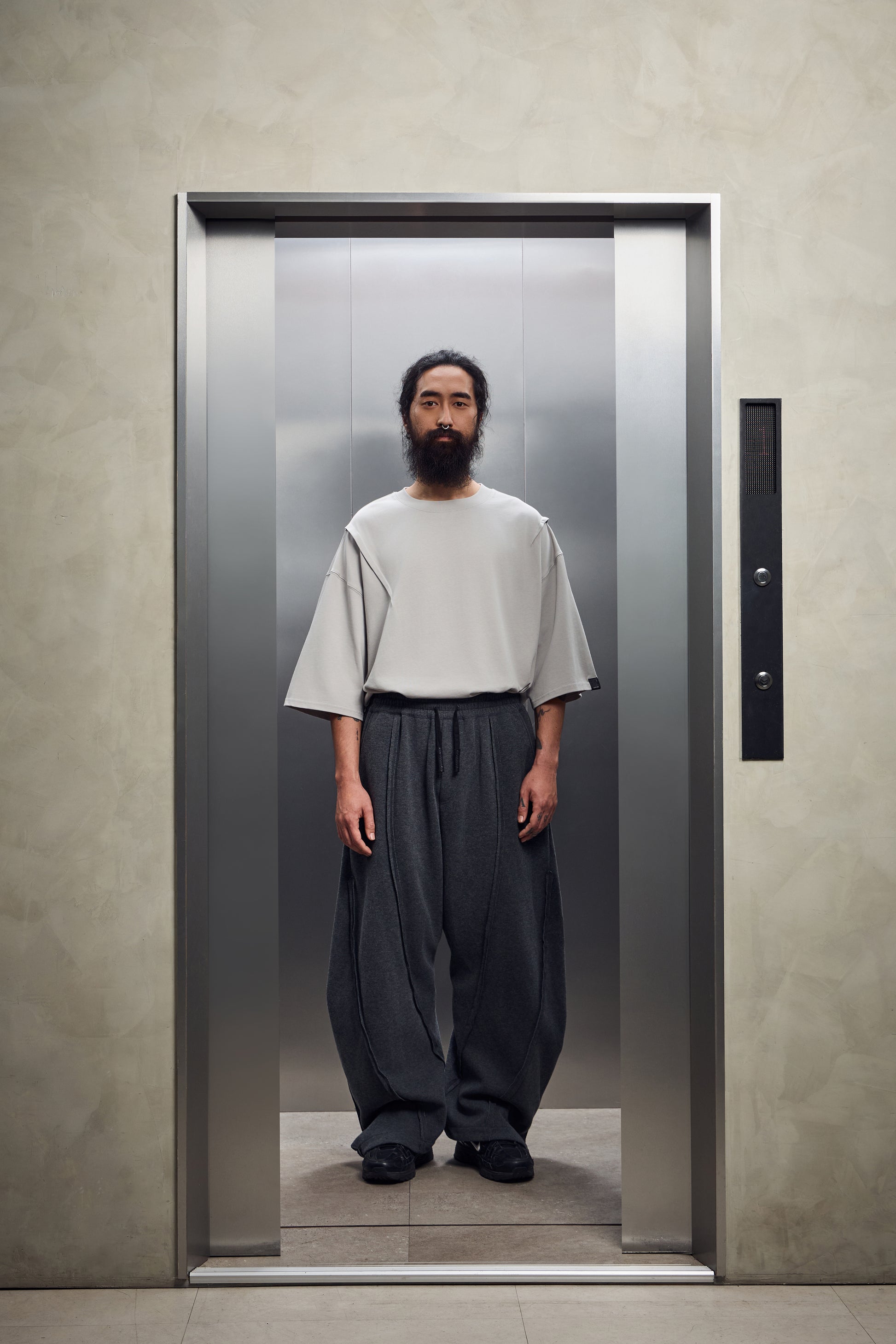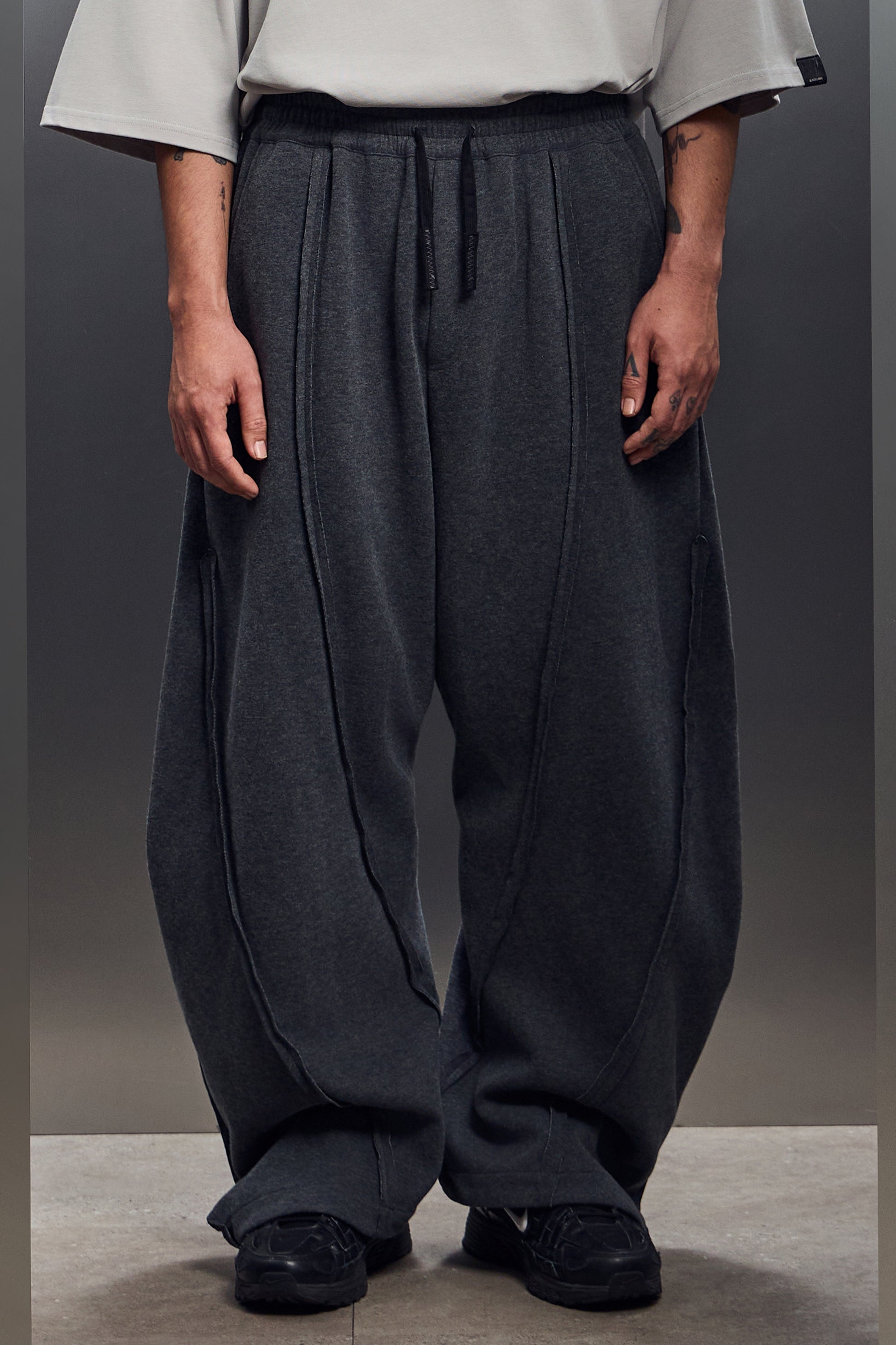 外露縫線搭配彎刀褲型,硬派街頭感搭上工裝剪裁,鬆弛中帶點工地氣息。