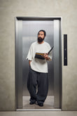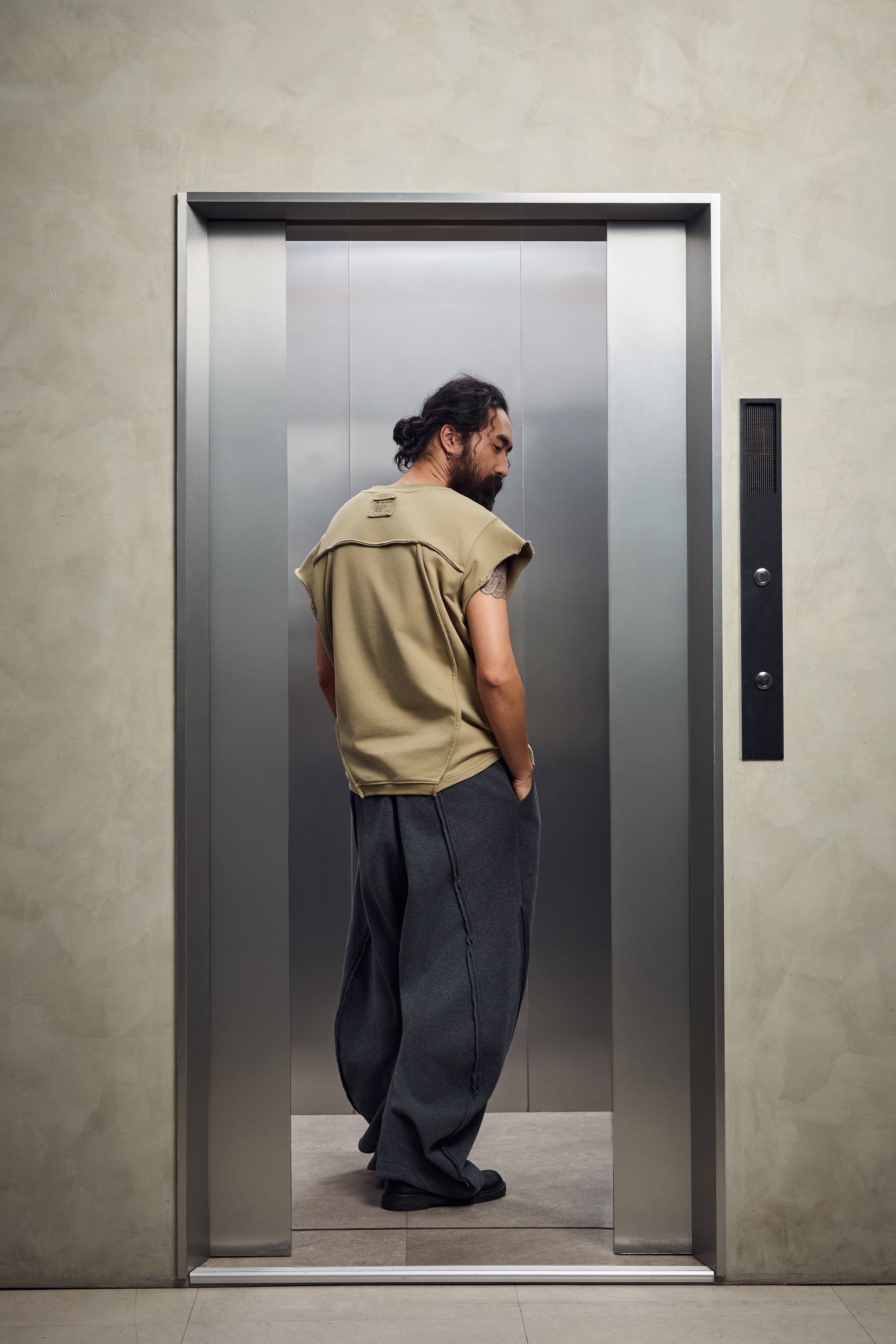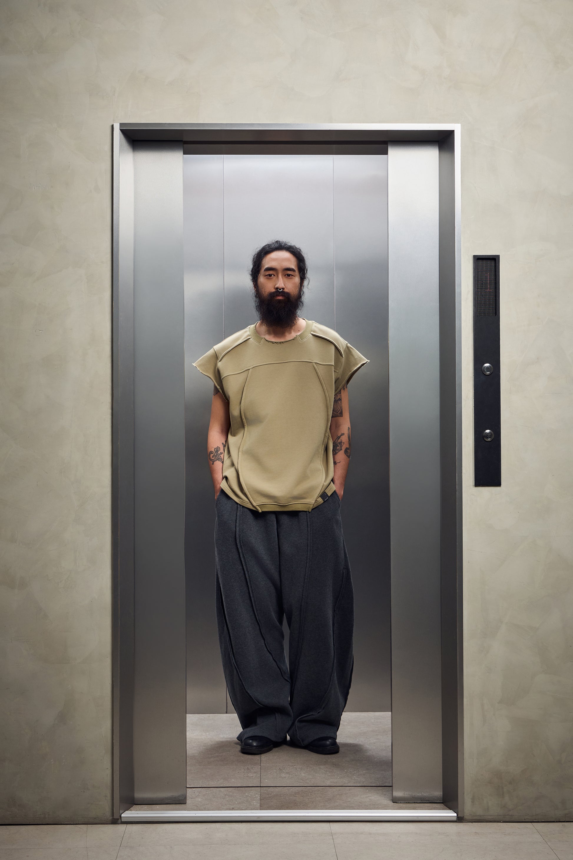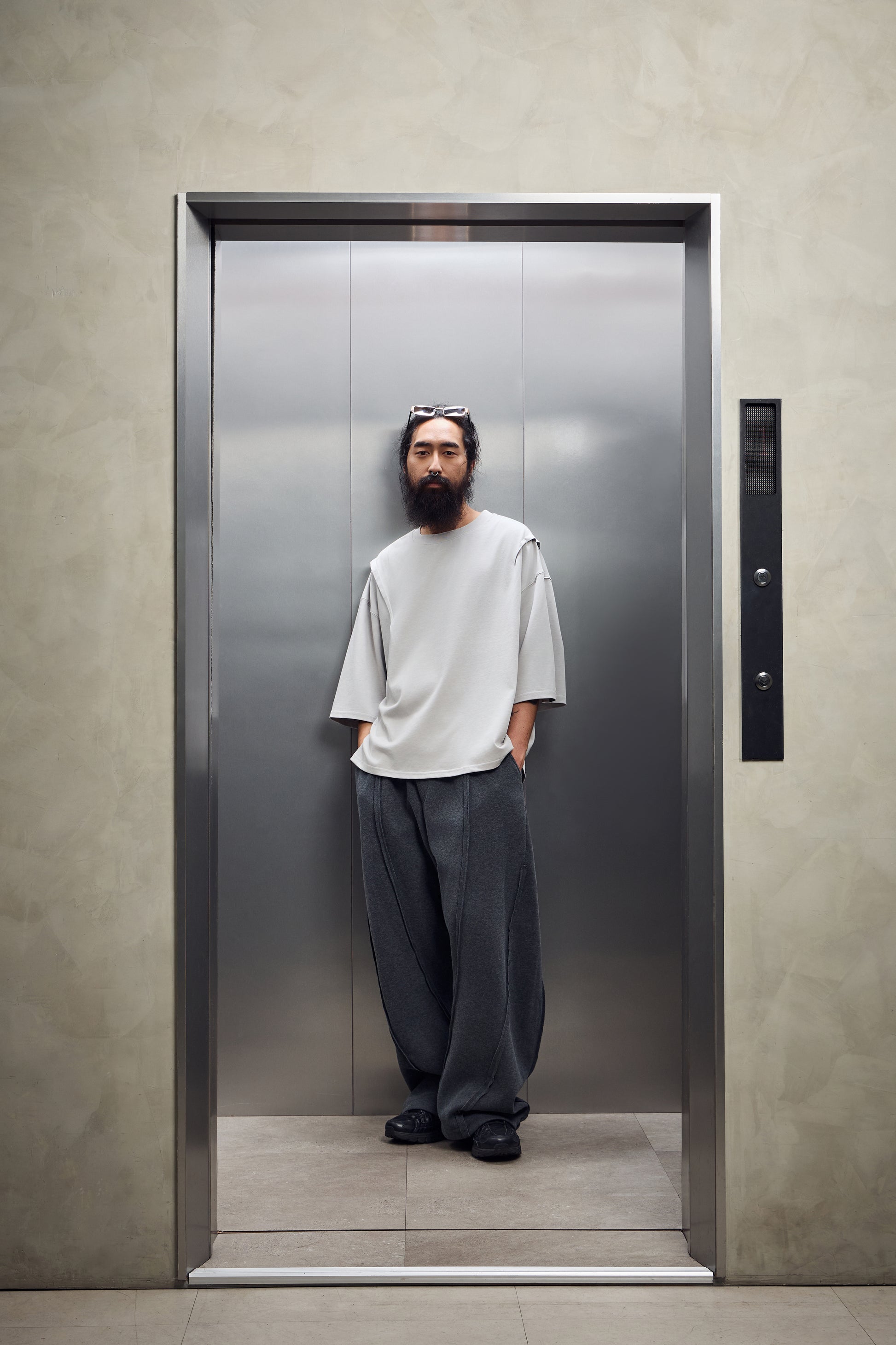 外露縫線搭配彎刀褲型,硬派街頭感搭上工裝剪裁,鬆弛中帶點工地氣息。