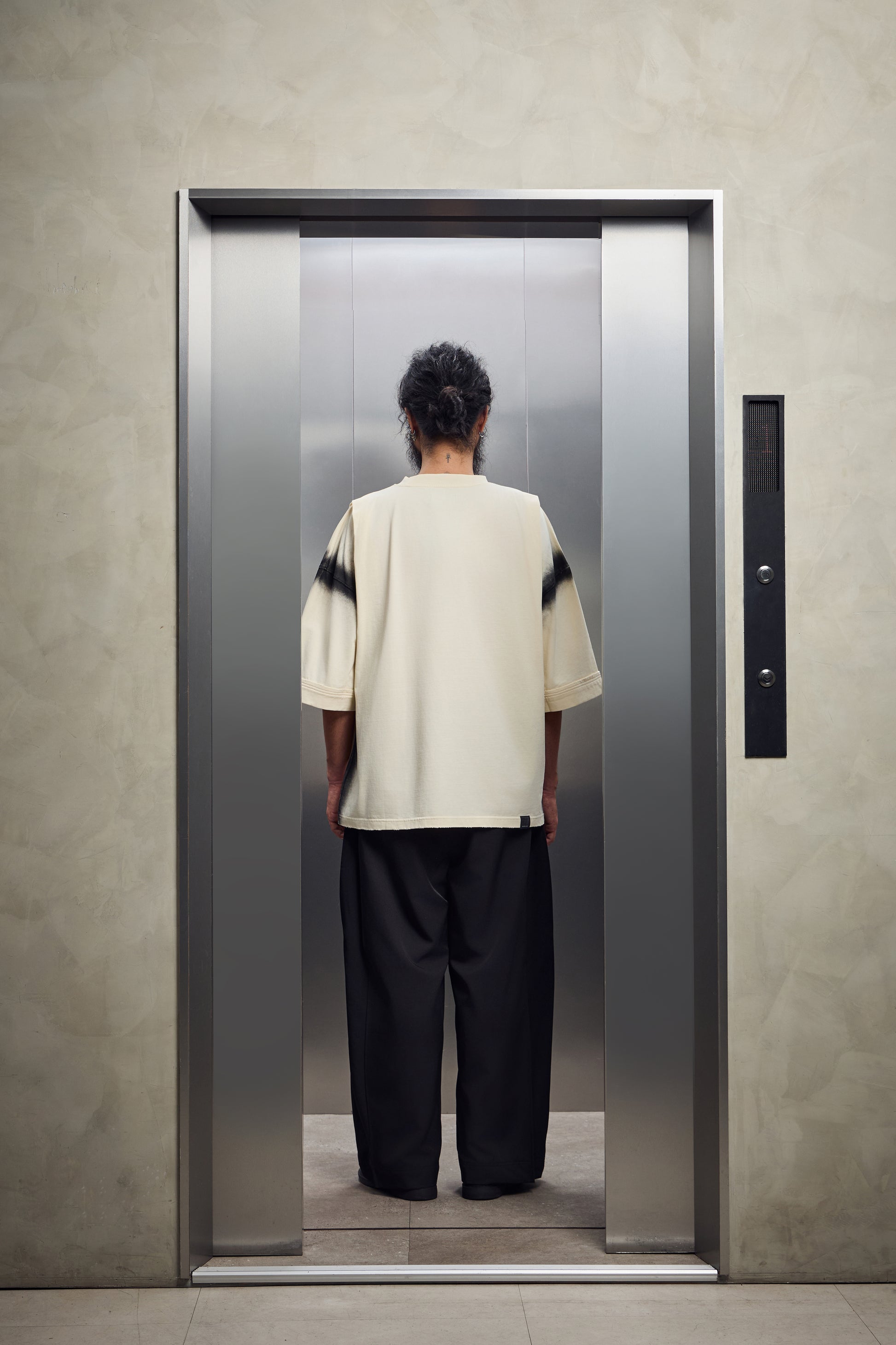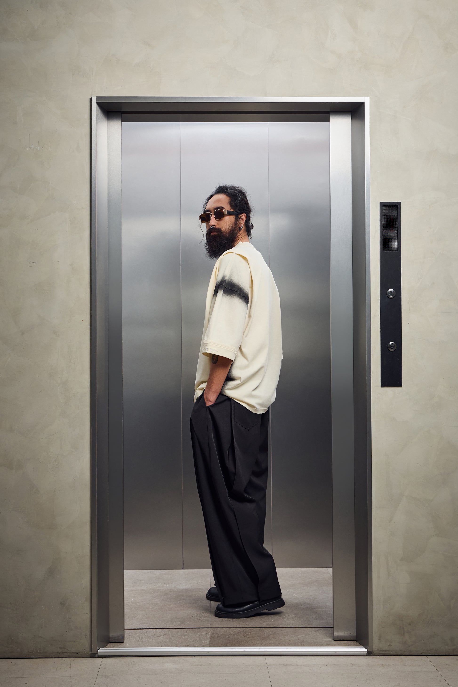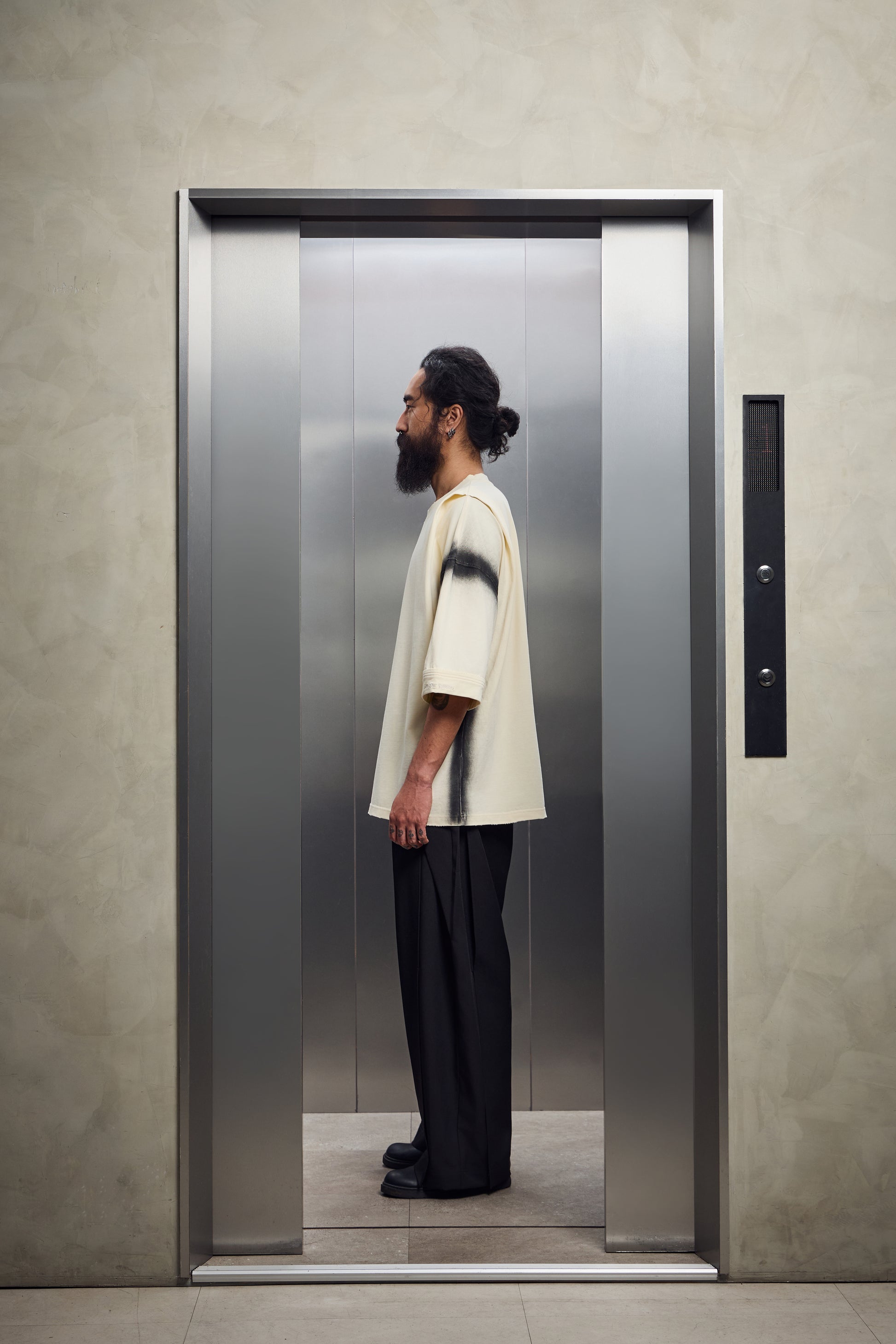 打摺肩線與仿舊噴漆感,營造電梯間上班族的微叛逆態度。
