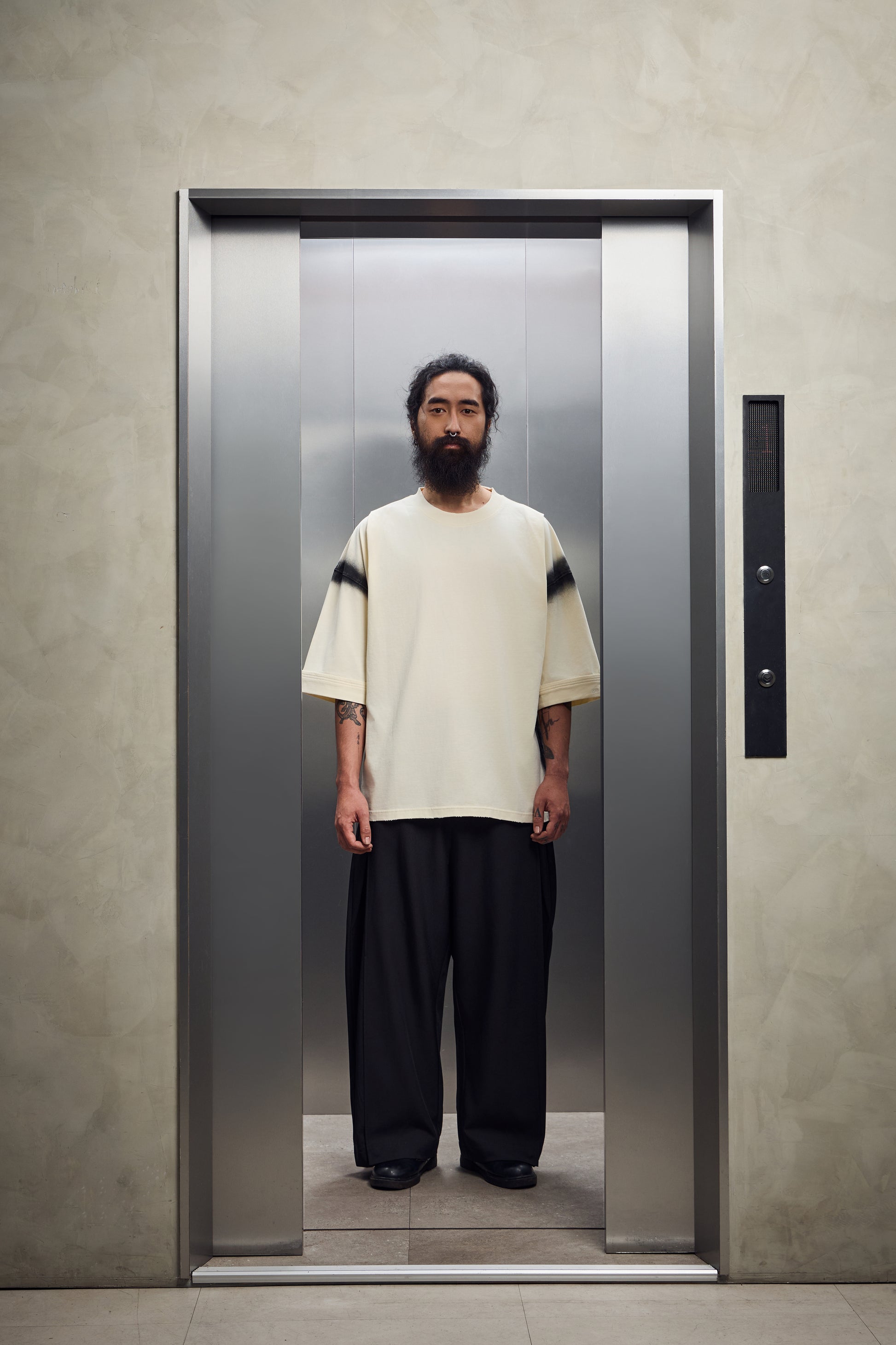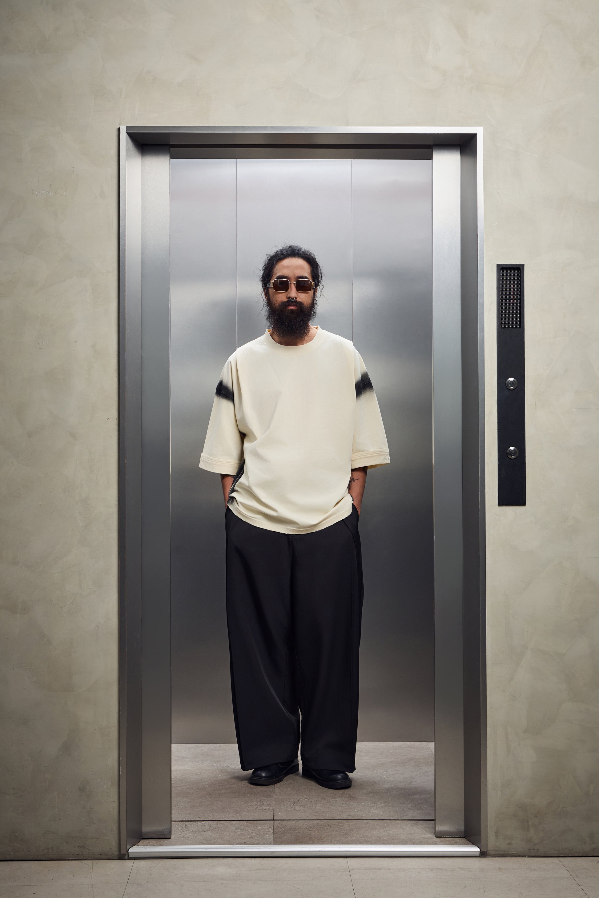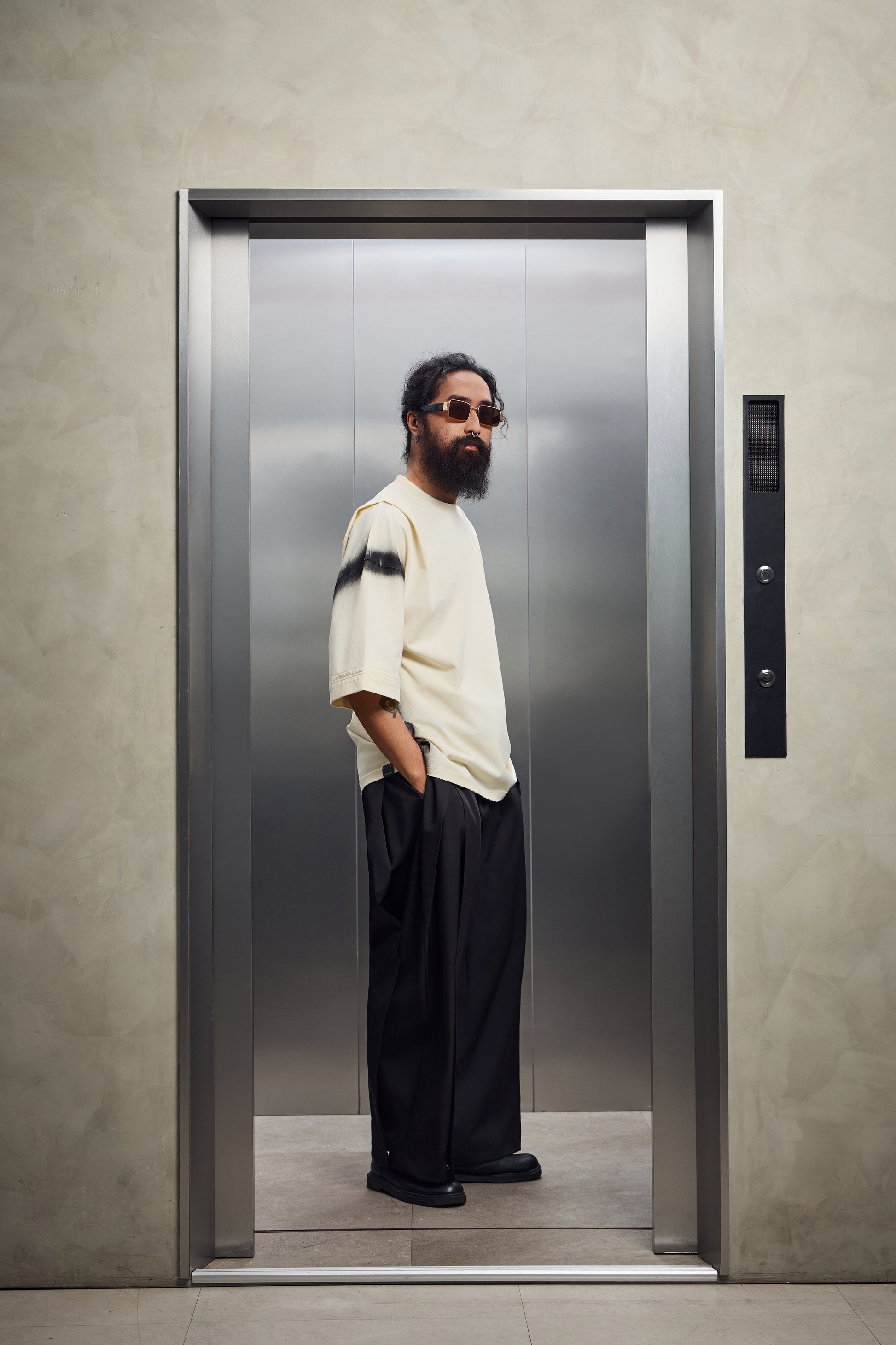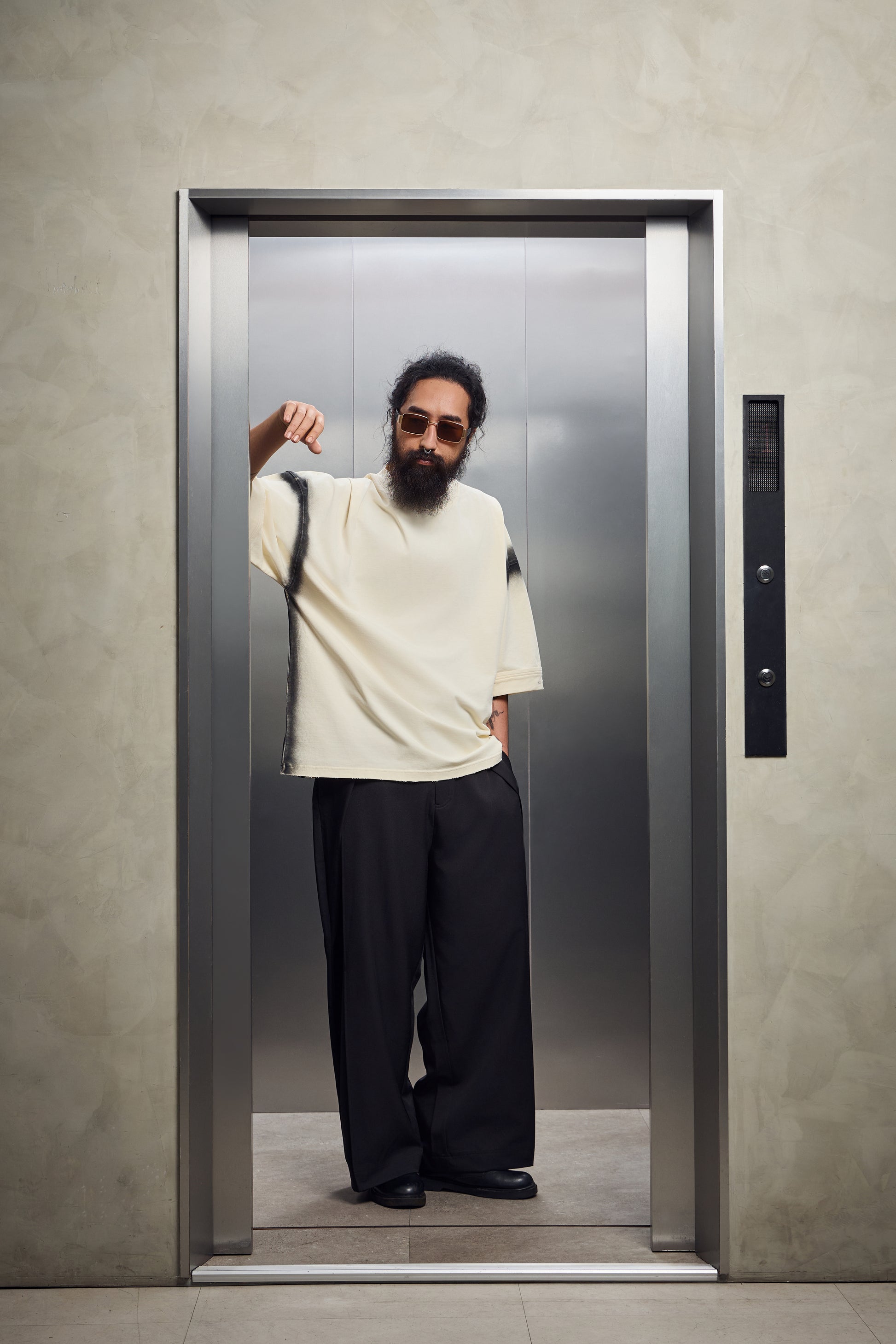 打摺肩線與仿舊噴漆感,營造電梯間上班族的微叛逆態度。