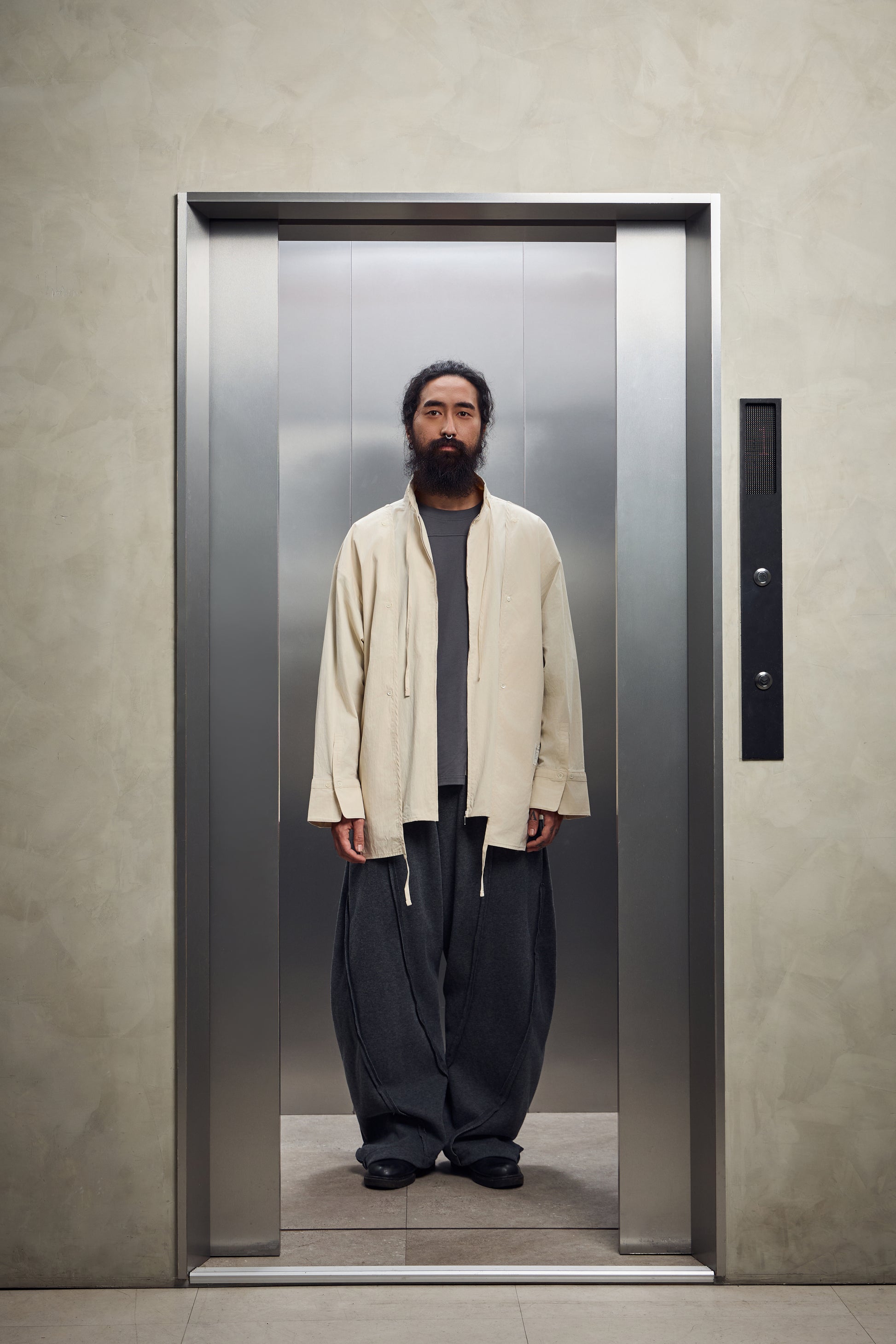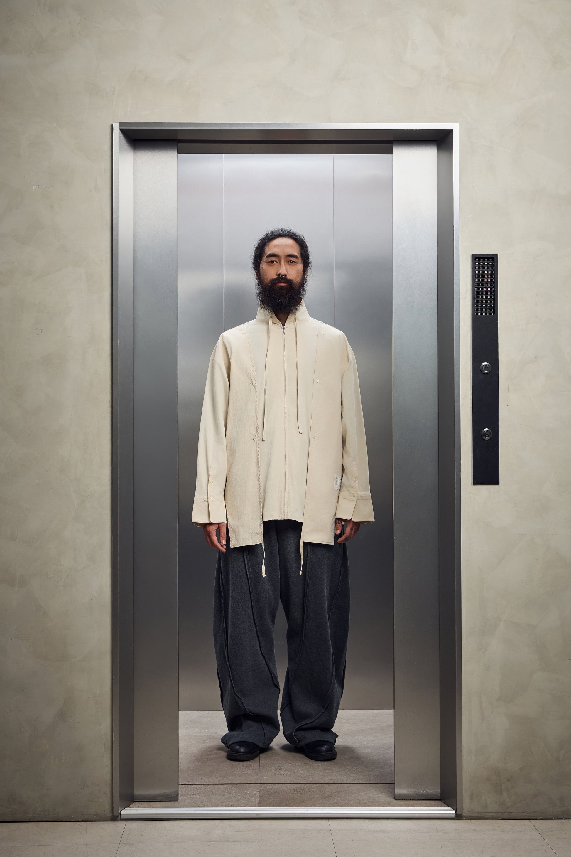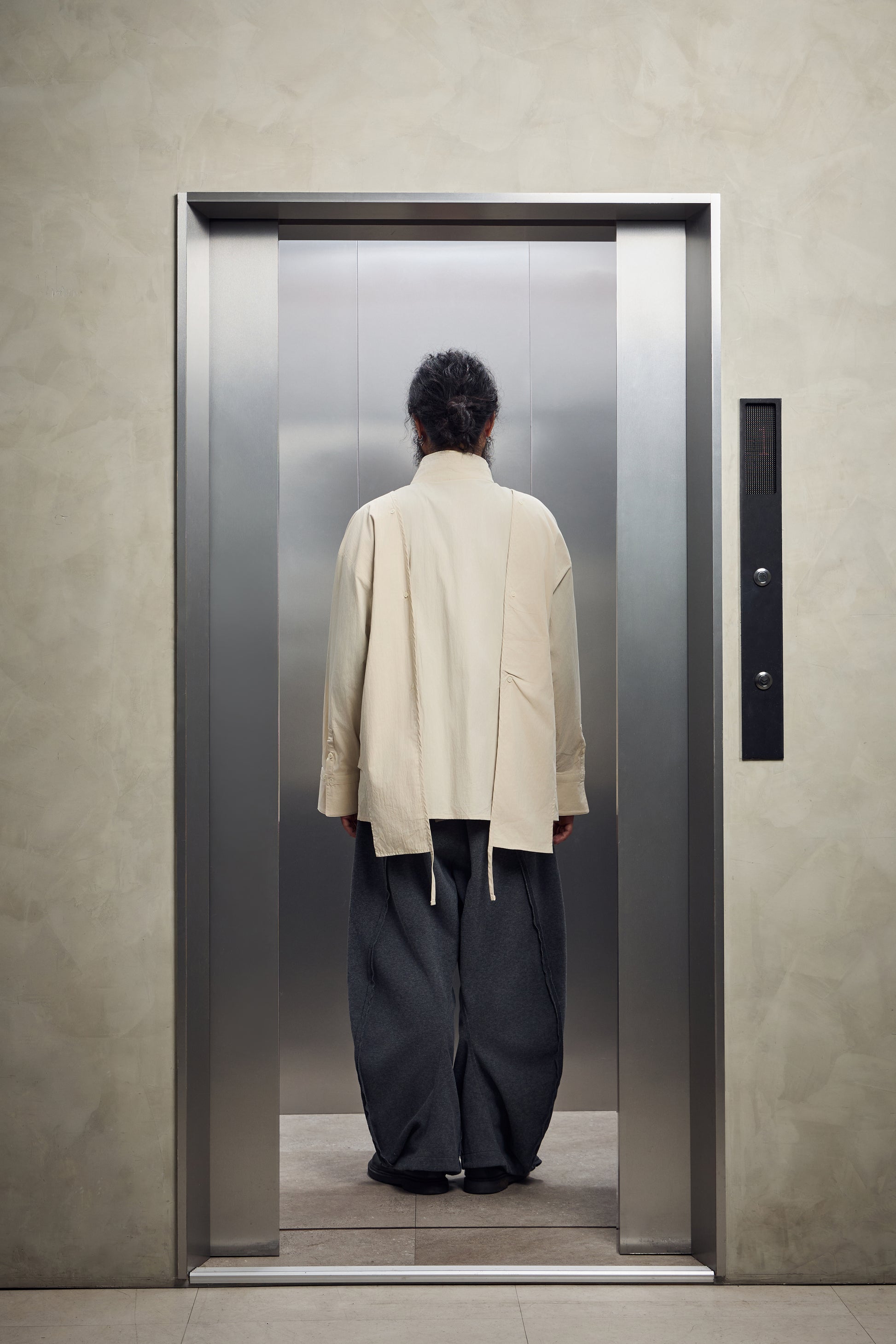 半解構疊釦+小立領,像鬆開領帶後的隨性,袖口綴帶與下擺標籤細節,暗藏鬆弛機能感。