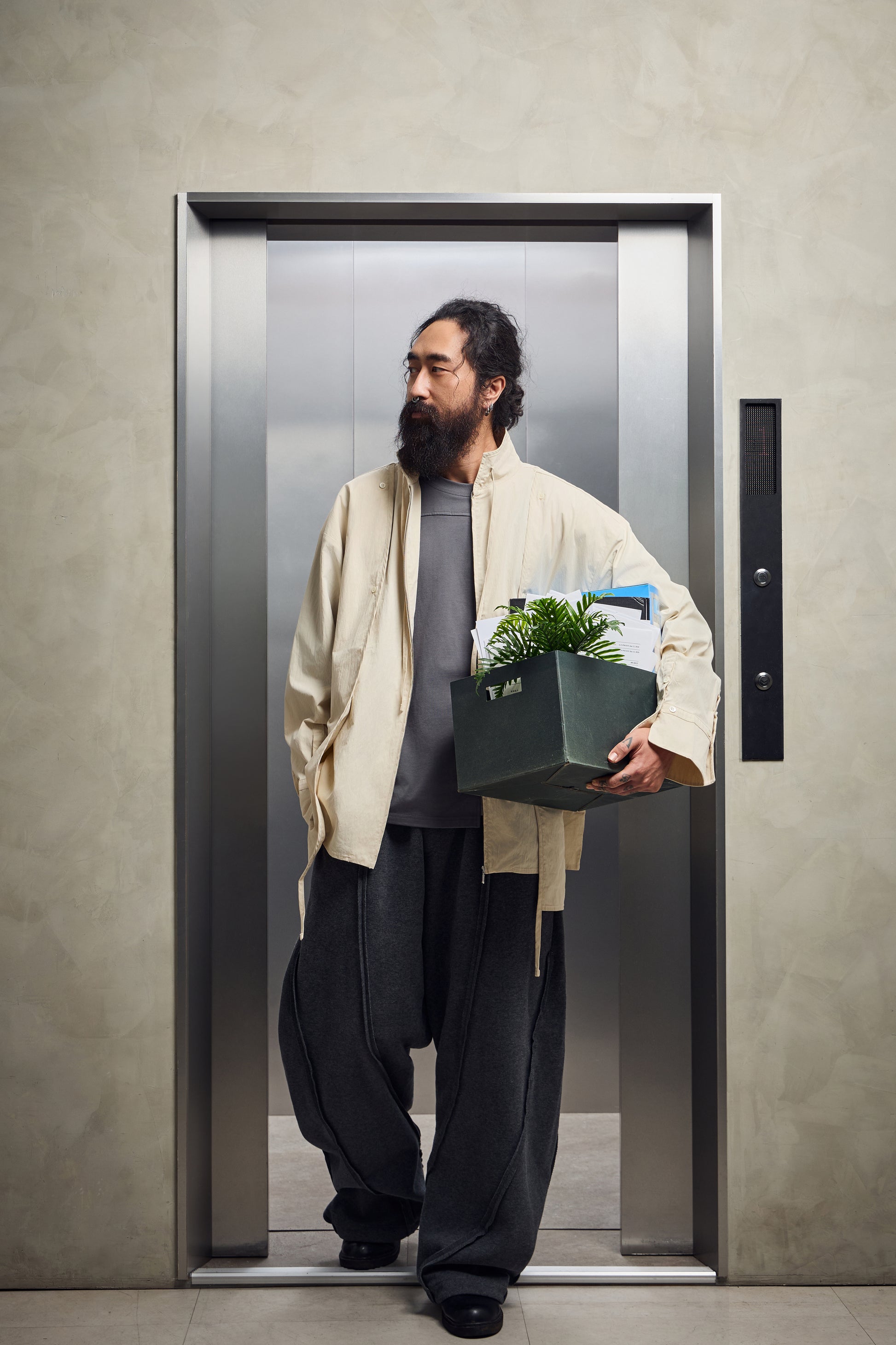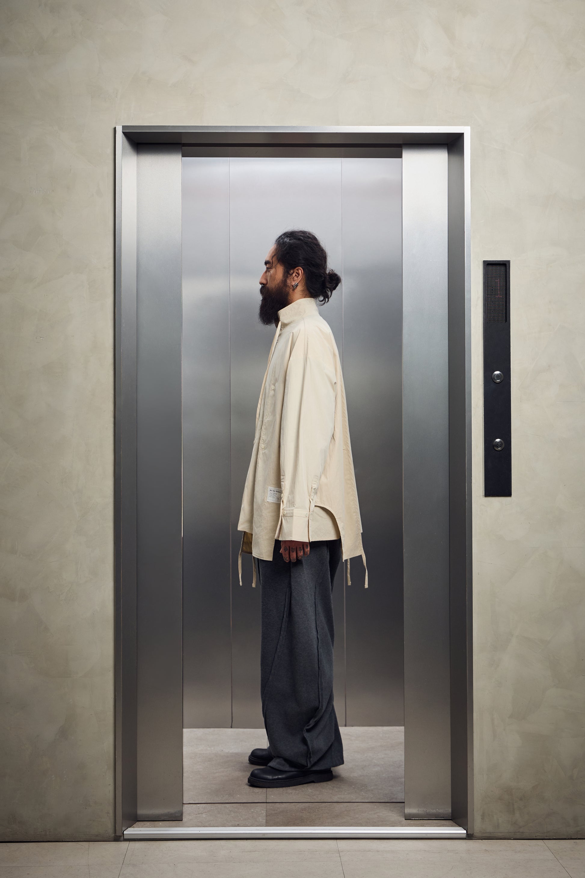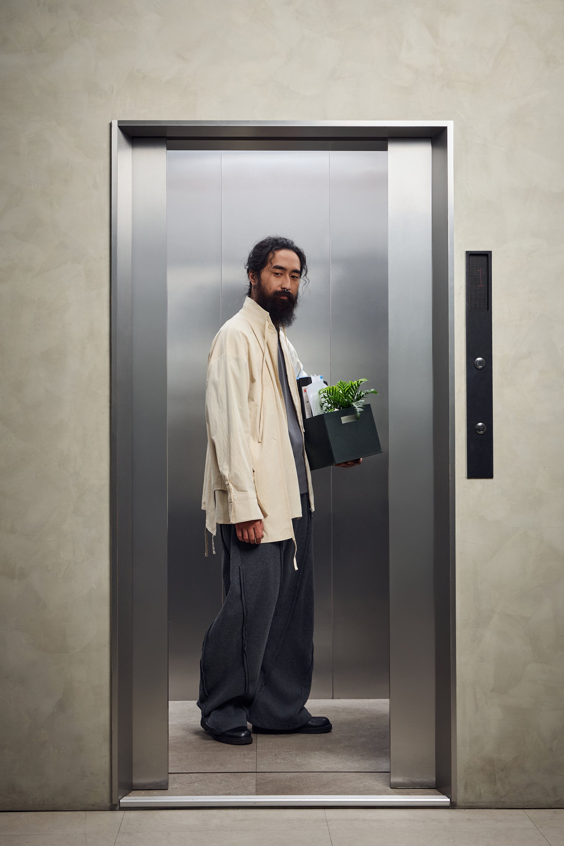 半解構疊釦+小立領,像鬆開領帶後的隨性,袖口綴帶與下擺標籤細節,暗藏鬆弛機能感。